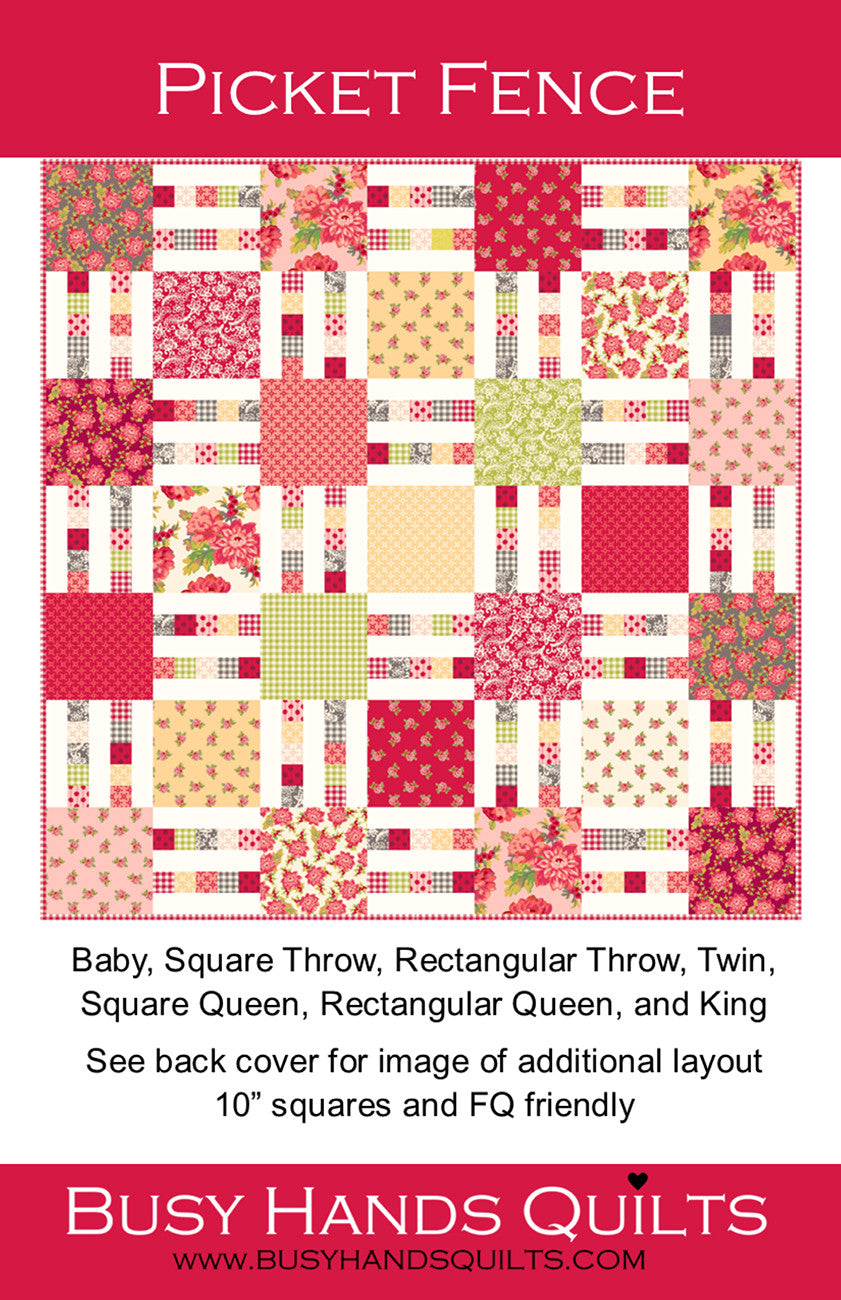 Picket Fence is a multi-sized quilt pattern that includes fabric requirements using 10" layer cake squares, fat quarters, or a combination of 10" squares and strips. Both square and rectangular Throws, as well as square and rectangular Queen quilts are included in this pattern. The blocks can be oriented different directions to change the look of the quilt, and both options are also included in the pattern. You'll love the easy-to-read charts and diagrams with detailed instructions for creating this striking quilt. Picket Fence is suitable for beginners and up. It has easy-to-follow, step-by-step instructions, charts and diagrams for cutting and piecing this easy quilt.