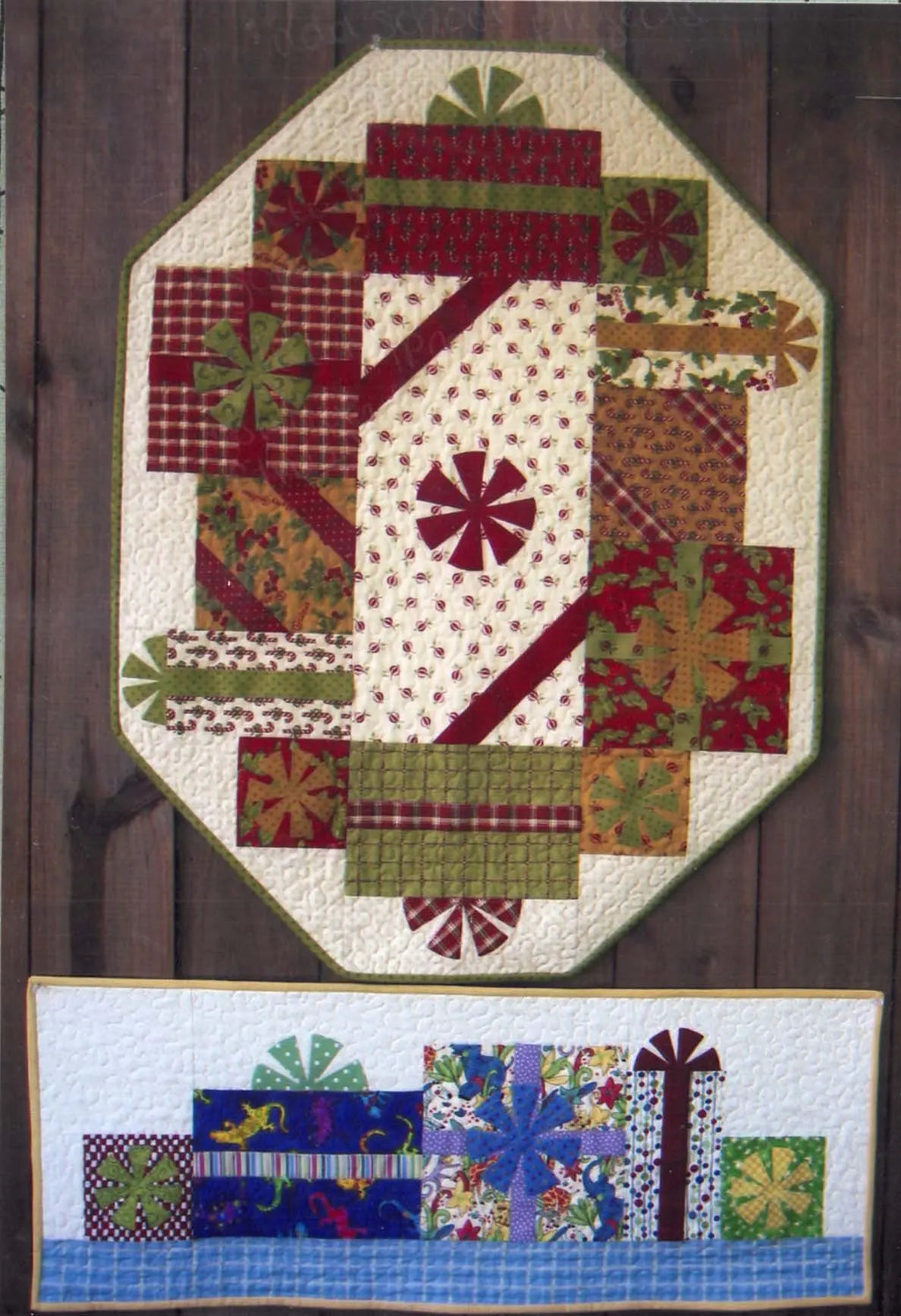 **Designs**: Christmas quilt - red, green, gold presents with intricate patterns; Birthday quilt - bright blue, green, purple presents with whimsical designs