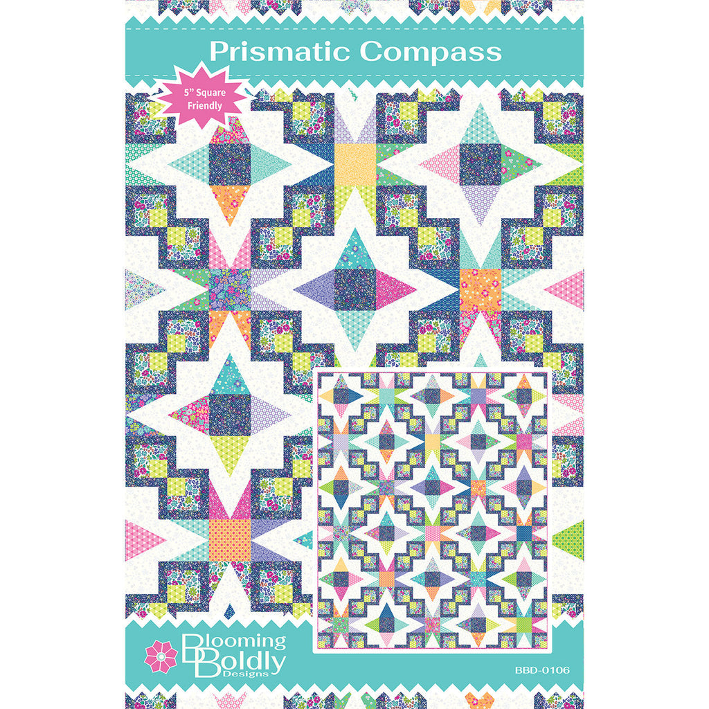 Prismatic Compass: May you find that any direction is the right direction with the Primatic Compass Quilt by Leslie Ryan of Blooming Boldly Designs. 5" square friendly. Finished size is 53" x 63 1/2". Traditional piecing methods, includes paper templates for the triangle in a square units. Even thought templates are included a Tri-Recs or Triangle-in-a-Square ruler is recommended for ease of cutting.