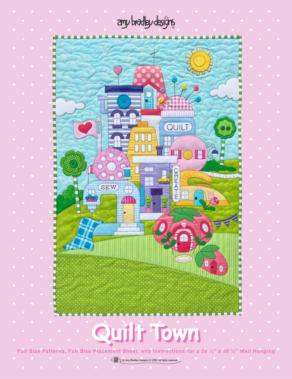 Quilt Town pattern includes full size patterns, placement sheet, and instructions to make this 20 1/2" x 30 1/2" wallhanging. The technique is fusible applique. The pattern includes links to helpful video tutorials.