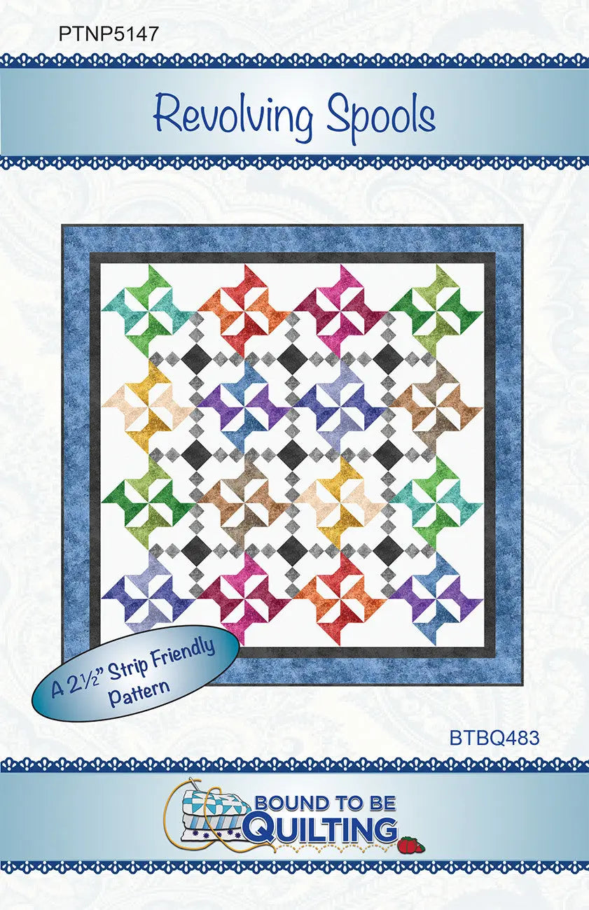A 2 1/2" strip friendly pattern! Ours uses bright colored strips from Northcott's Vestige collection. The design centers on sewing spools that rotate around alternate chain blocks. Finished size is 81" x 81" and skill level is confident beginner.