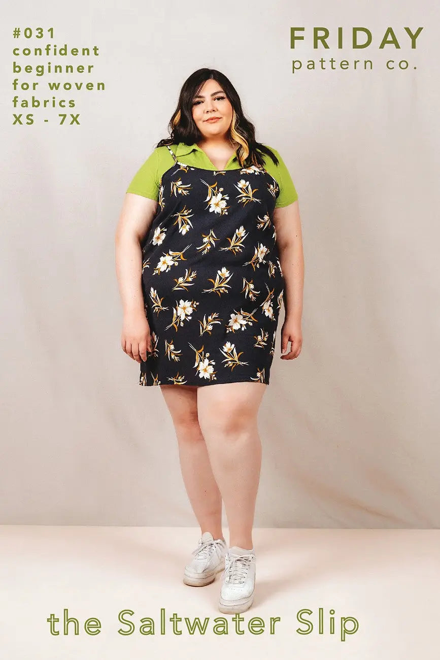 The Saltwater Slip is a simple slip dress with adjustable straps that can be layered or worn on its own. The pattern comes with two length options: above the knee, and tea length (with side slits). It also comes with optional side ties to add a bit of waist shaping. Wear this slip over a tee shirt, under a sheer dress, or on its own! The pattern comes in sizes XS-7X and includes multiple cup size options (B/C and C/D). This is a pullover dress with no closures. You'll want to make this easy-to-sew slip again and again!