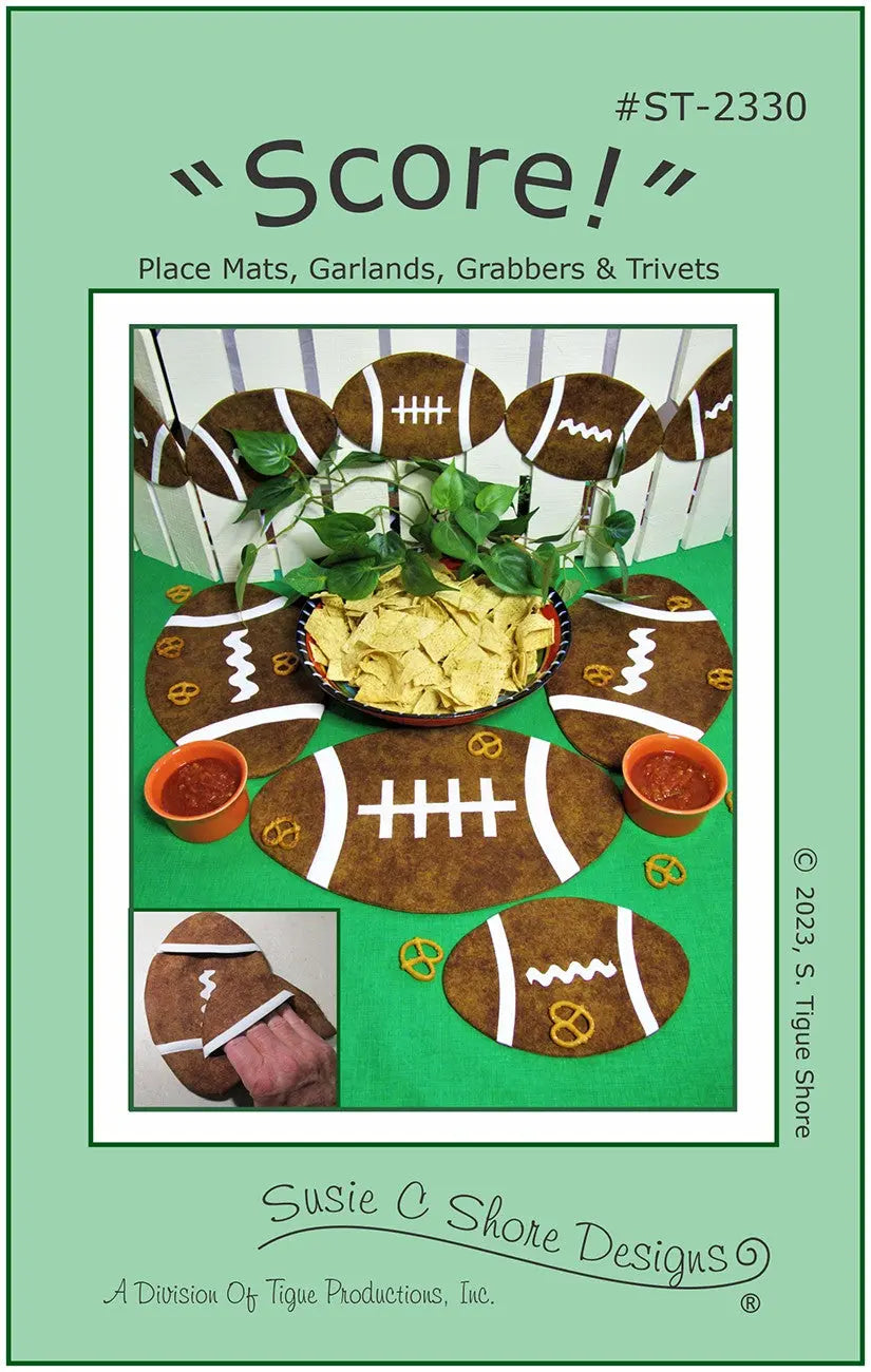 Score some points for your Football Game Day Parties with these simple, easy projects! Pattern includes instructions & full-sized pattern pieces to make Football Place Mat(s), Table Toppers, Microwave Grabbers, Trivets/Coasters & Football Garlands. Not just for Game Days but for everyday use for your Football Fans! Make some happy memories at home; makes great gifts too! Approximate finished sizes: Place Mats 15" X 10”; Grabbers & Trivets 8-½" x 5-½", and Garland any size you want!