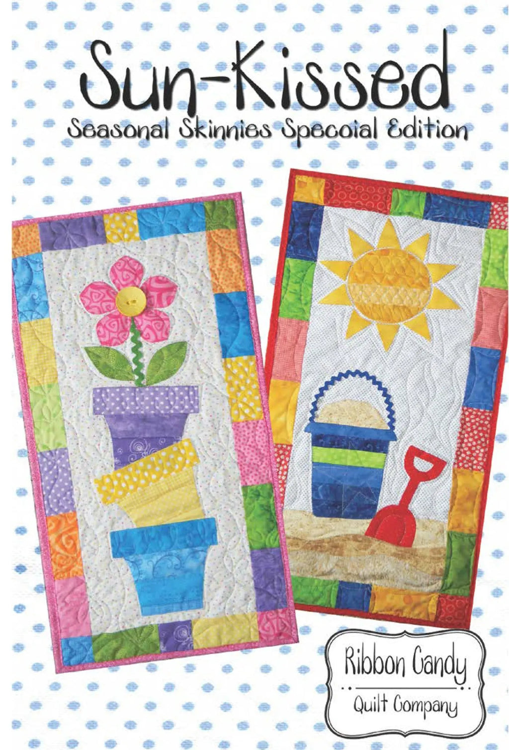 Seasonal Skinnes Sun Kissed - Special Edition - Fusible Applique: Discover the charm of summer with the Sun-Kissed Seasonal Skinnies Special Edition Fusible Applique, perfect for adding a touch of sunshine to your projects. This special edition features two delightful designs: a vibrant flower pot with blooming flowers in shades of pink, purple, and green, accented by a cheerful yellow button, and a playful beach scene with a bright blue pail, a sunny yellow sun, and a red shovel. Each design is framed by colorful patchwork borders that enhance the festive feel. Ideal for quilters and crafters, this fusible applique measures 14in x 28in, making it a versatile addition to your summer-themed creations.