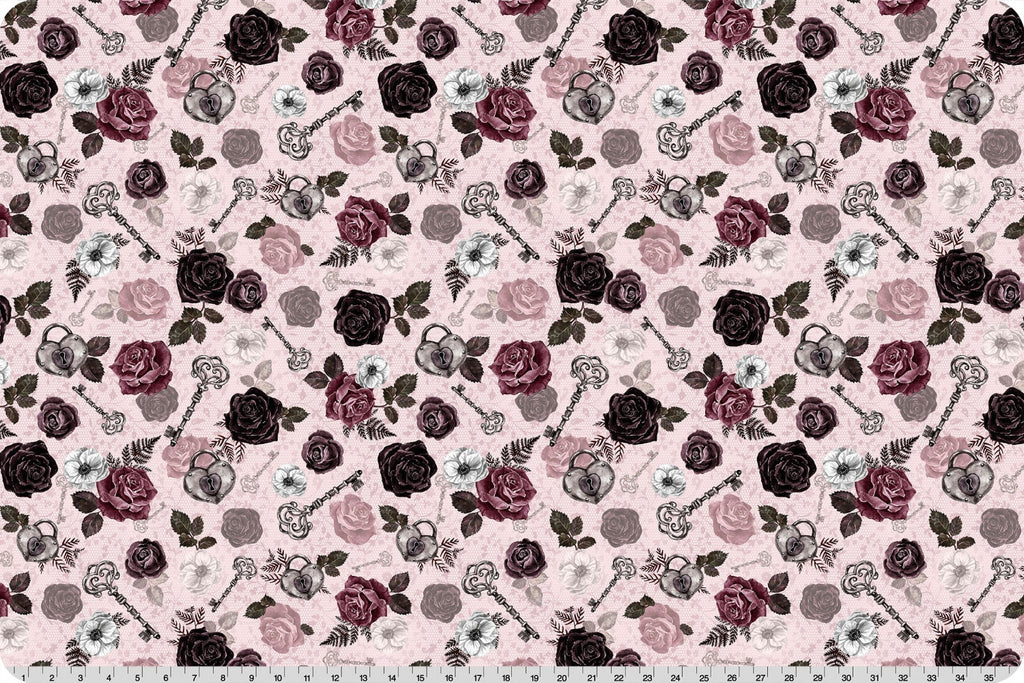 Secret Crush Digital Cuddle® minky plush fabric evokes romance with deep, moody roses layered over a subtle lace background, accented by delicate keys and lockets for an elegant, mysterious feel. Printed digitally on a 2.5 mm pile fabric, the ultra-soft, smooth texture of Cuddle® minky is perfect for quilts, throw blankets, pillows, and more!