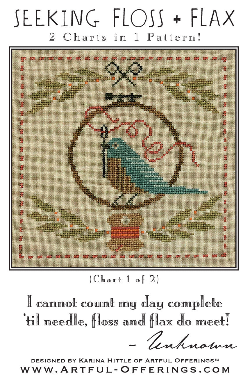 Seeking Floss + Flax Pattern No. XS25206 Perched in a wooden embroidery hoop, a brilliant bluebird holds a threaded needle in her beak. A pair of Putford scissors and floss wound-around a small bobbin, adorna leafy garland. A second chart complements the primary with the text, "Seeking Floss + Flax", in a simple easy-to-read font, also featuring a pair of Putford scissors within a simple garland. This charming pattern contain two charts and is sure to be a favorite for years to come! NOTE: Chart # 1 of 2 (bluebird design) was featured in a private stitching club in November 2023.