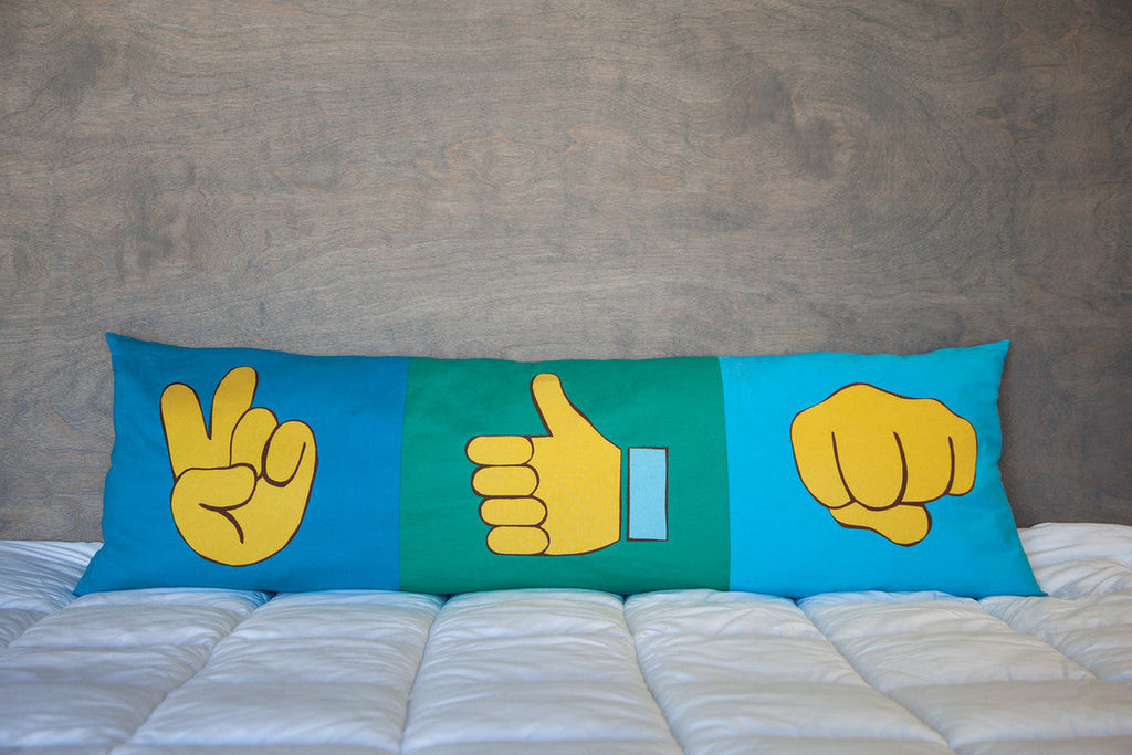 • Sew an OMG-worthy sampler quilt with fifteen emoji blocks, plus circular emoji throw pillows, a pillowcase, and a bolster