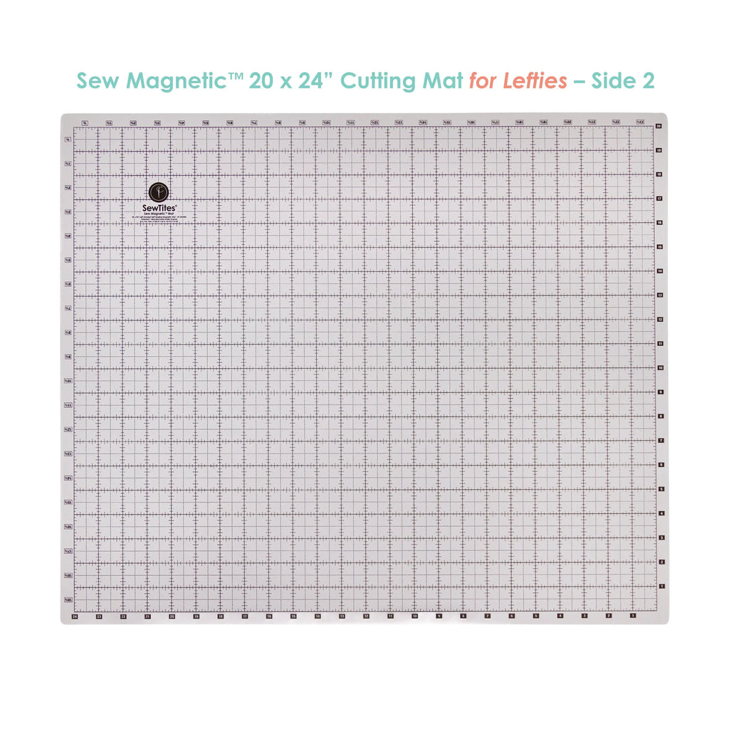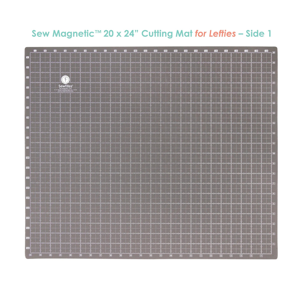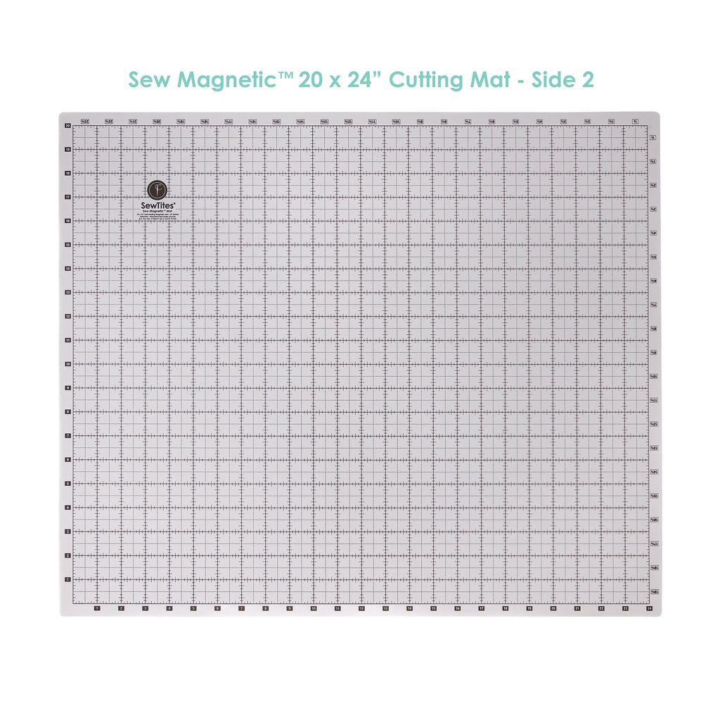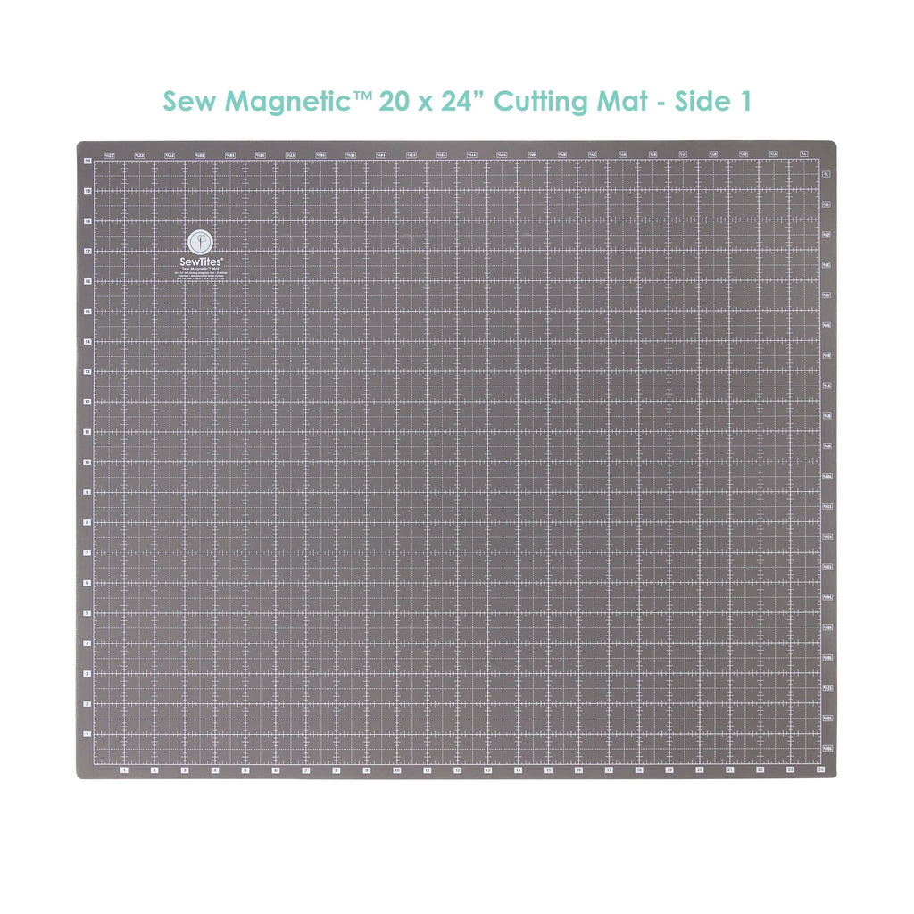The Sew Magnetic Cutting mat is a 20 x 24" double-sided, 7-layer self-healing magnetic cutting mat – one side is dark grey with white lines, while the other is light grey with black lines.