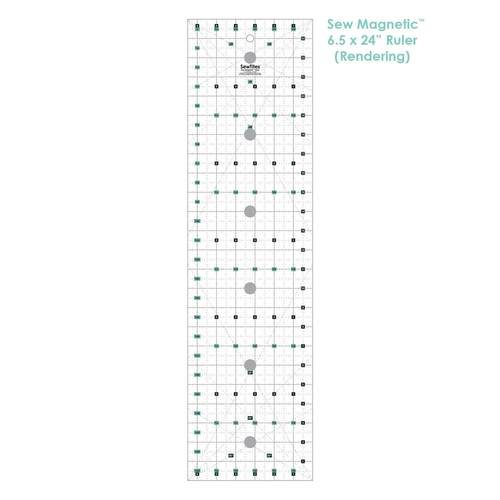 The magnetic ruler is a 6.5 x 24" acrylic ruler with turquoise and black imprint – the 1/2" numbers are in turquoise boxes, and the 1" numbers are in black boxes.