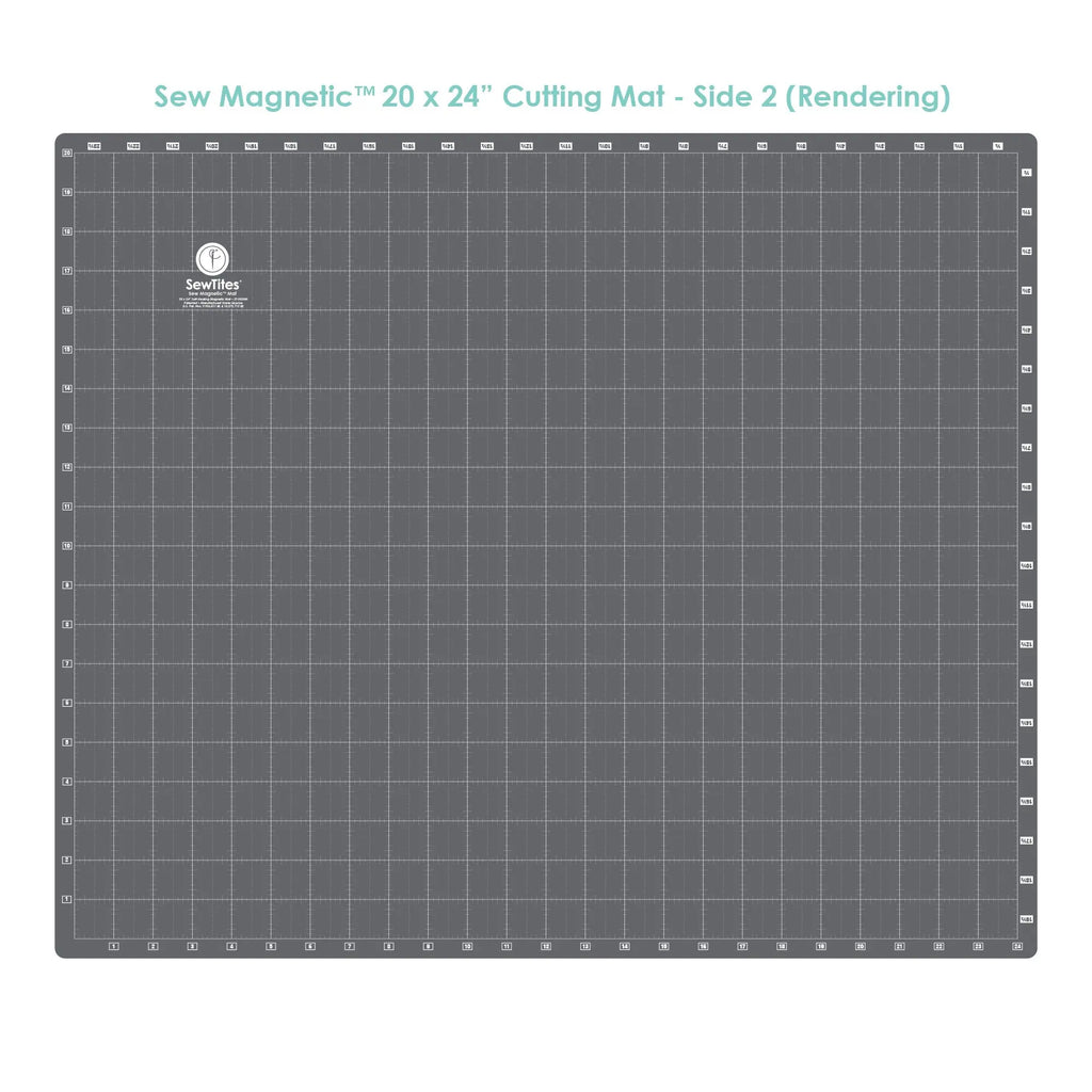 The mat is a 20 x 24" double-sided, 7-layer self-healing magnetic cutting mat – one side is dark grey with white lines, while the other is light grey with black lines.