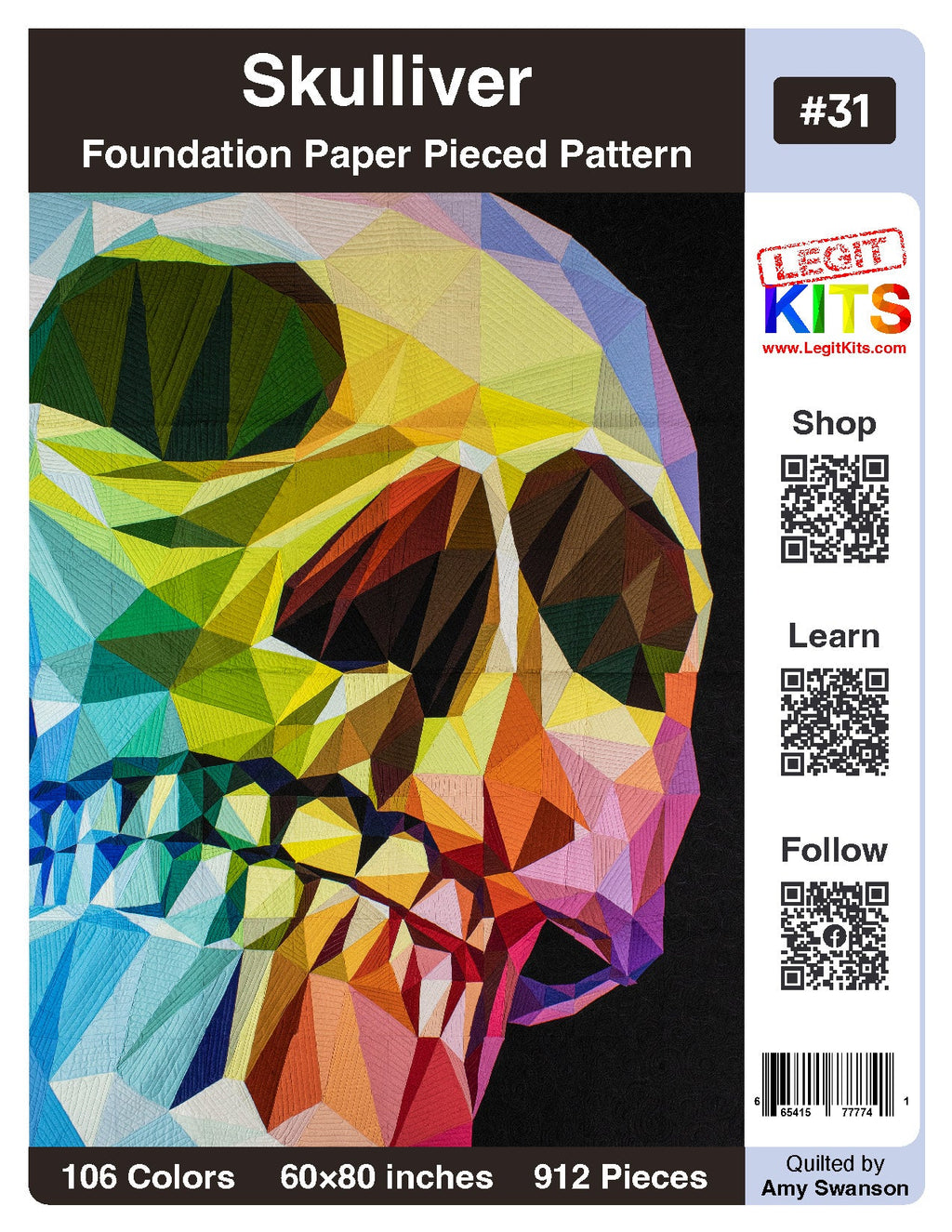 EPIC. Skulliver combines dramatic angles, a full rainbow of colors, elegant shading, compelling imagery, and is a quilt that captivates. Skulliver is a luxury item, a premium design with everything a foundation paper piece quilter could want. Designed with bright colors, this quilt top kit will make a fabulous full sized quilt top. Our kit contains color maps, fabric lists, an assembly guide, the full pattern printed on foundation paper, and ample cuts of 106 different shades of Robert Kaufman Kona Cotton Solids to complete this large sized, 60 inch wide by 80 inch long quilt top.