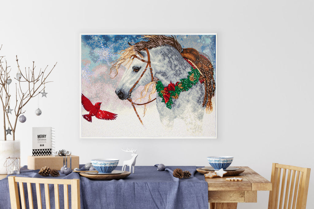 Snowy Christmas: Capture the quiet beauty of winter with Snowy Christmas diamond painting kit. This serene full-coverage diamond art kit features a graceful white horse and a bright red cardinal set against a peaceful snowy landscape. Create a project that reflects the spirit of the season in sparkling detail.
