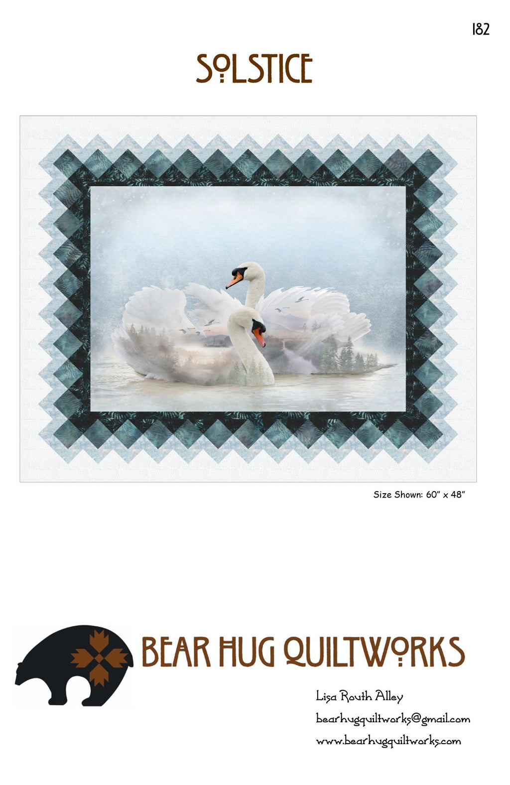 Solstice: An easy but graphic way to frame a wonderful panel or favorite fabric. The pattern includes instruction on how to size your panel to fit the blocks. Size shown using Hoffman Fabrics Call of the Wild panel is 60" x 48".