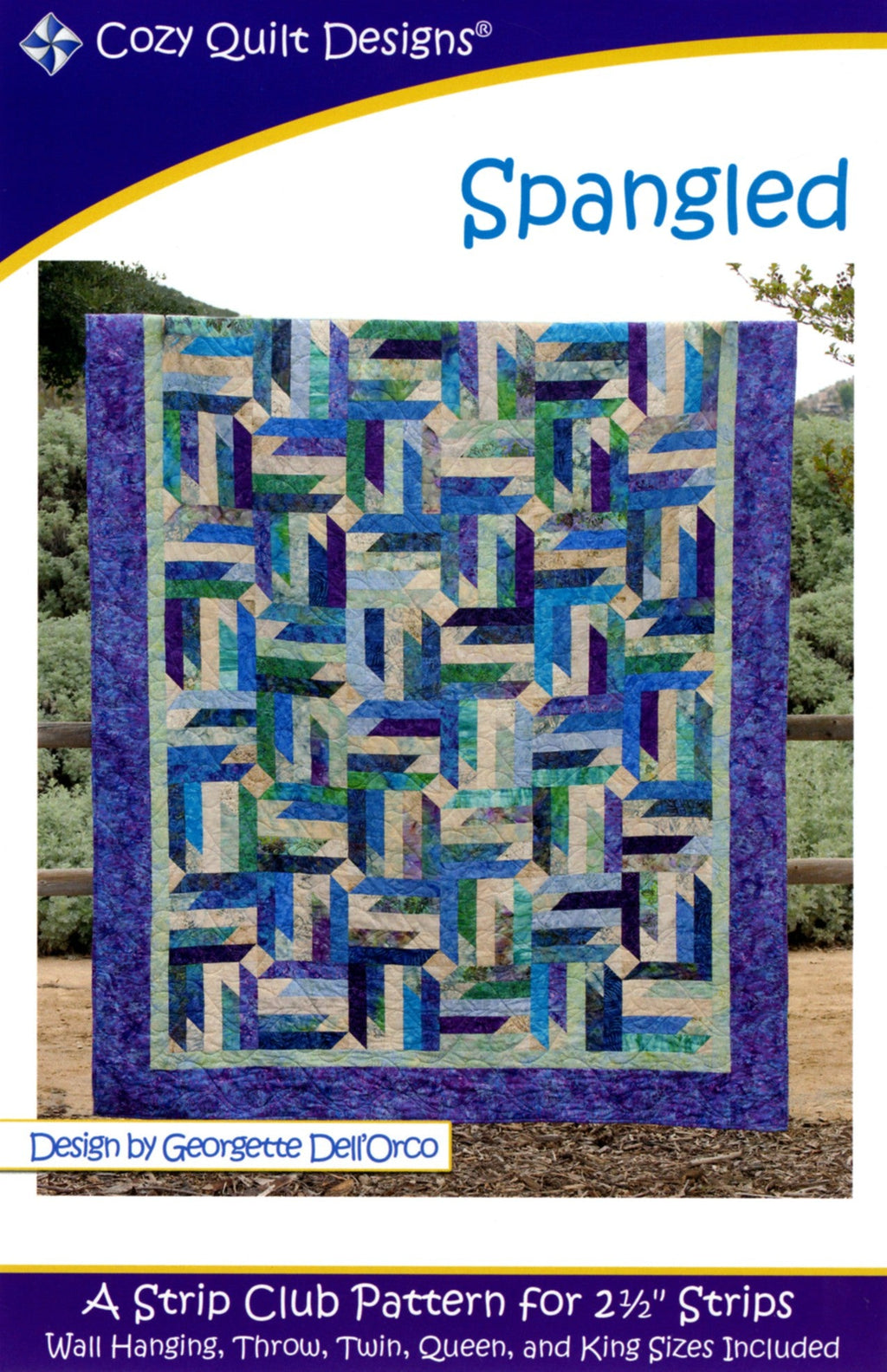 Spangled A Cozy Strip Club Pattern Designed for 2½" Strips This wonderful pattern uses nothing but 2½" strips and borders! Strips come alive with this simple yet striking design. Use batik, floral, or Asian prints for a wonderful quilt. Or go patriotic with red and blue fabric. You can even use pre-cut ½" strips for the background! The pattern includes instructions for: Wall Hanging 56in x 56in Throw 76in x 76in Twin 76in x 96in Queen 96in x 96in King 112in x 112in