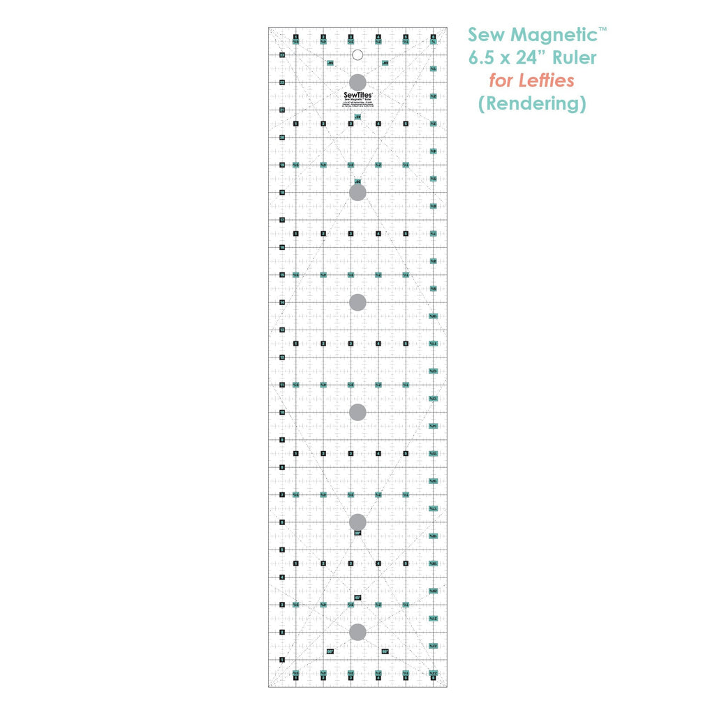 The magnetic ruler is a 6.5 x 24" acrylic ruler with turquoise and black imprint – the 1/2" numbers are in turquoise boxes, and the 1" numbers are in black boxes.