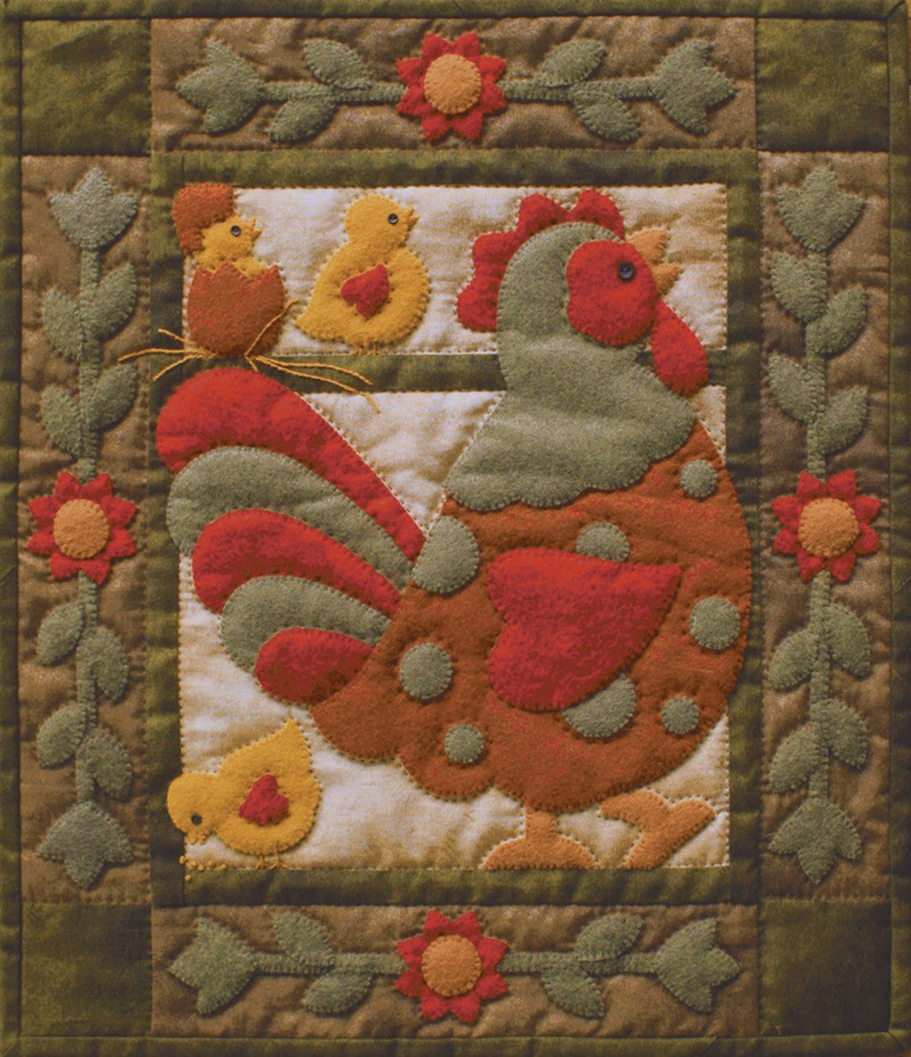 It’s morning on the farm! Alert and on task for the early wake-up call, Spotty Rooster is joined by two baby chicks – one still breaking out of its shell! A third chick, oblivious to the ruckus, fortifies for the day with a breakfast of cracked corn. A floral border surrounds them. Finished size is 13in x 15in. Kit includes all woolfelt for applique, all fabrics (100% cotton) for background, borders, back, and binding, batting, buttons for eyes, embroidery floss, precise patterns and complete illustrated instructions. Colors are rust, green, red, gold, brown, and beige.