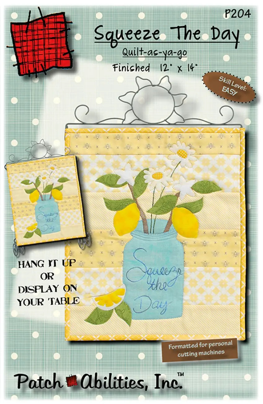 Finished size 12 x 14 in. Squeeze the day with fast and easy quilt as you go piecing. Make this lemon theme pattern the quickest quilted lemon home decor for you to make! Love lemons or lemon branch decor? This is for you, with buttery light yellows as the back ground, a vintage Ball canning jar vase for lemon branches and white daisies, lemon slice lying next to the Mason jar. The words Squeeze the Day embroidered on the Ball jar to mimick the antique Ball logo. This pattern stitches up fast with a super easy quilt as you go method that anyone can follow, using the great pattern directions (even images). No official machine quilting is needed - hooray! Kits up even faster. Teach this pattern to beginners learning how to piece, machine quilt and bind. Skill level is Easy. Pattern includes beginner tips and complete binding instructions.
