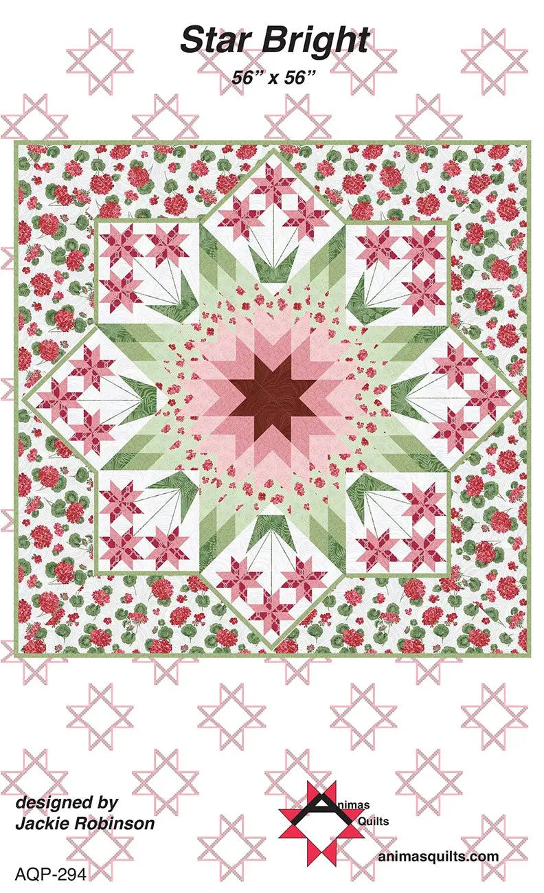 Star Bright is a floral lone star variation calling out beautiful geraniums in pinks and reds. Features "Betty's Geraniums" by Jackie Robinson & Benartex. Available in lap size (56"x56") but would complement well as a wall-hanging too.