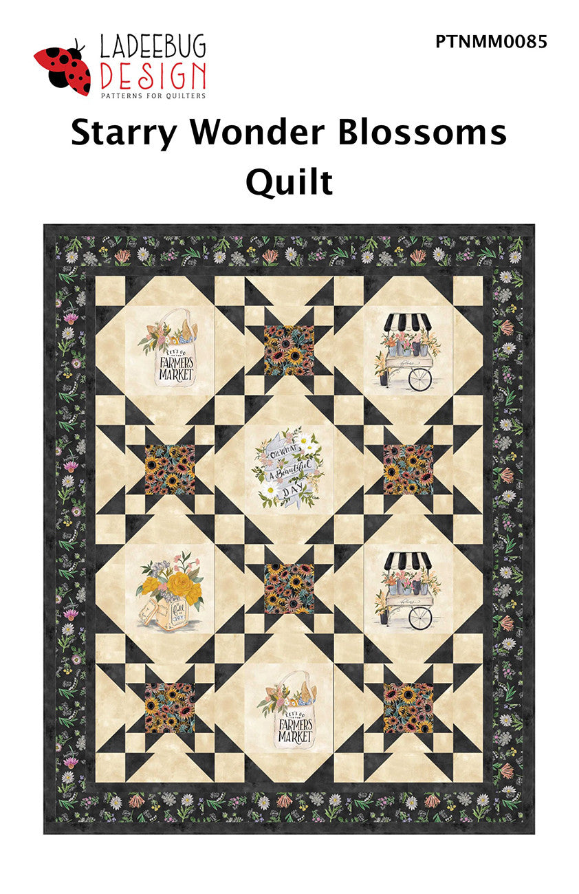 Starry Wonder Blossoms: Features Michael Miller's Flower Market collection. Finished size: 49" x 61". Confident Beginner - precise cutting. This design uses starts with fussy cutting the block panel. A series of stitch and flip corners and borders are added to complete the quilt. This design is not on-point and there are no triangles to cut or piece.