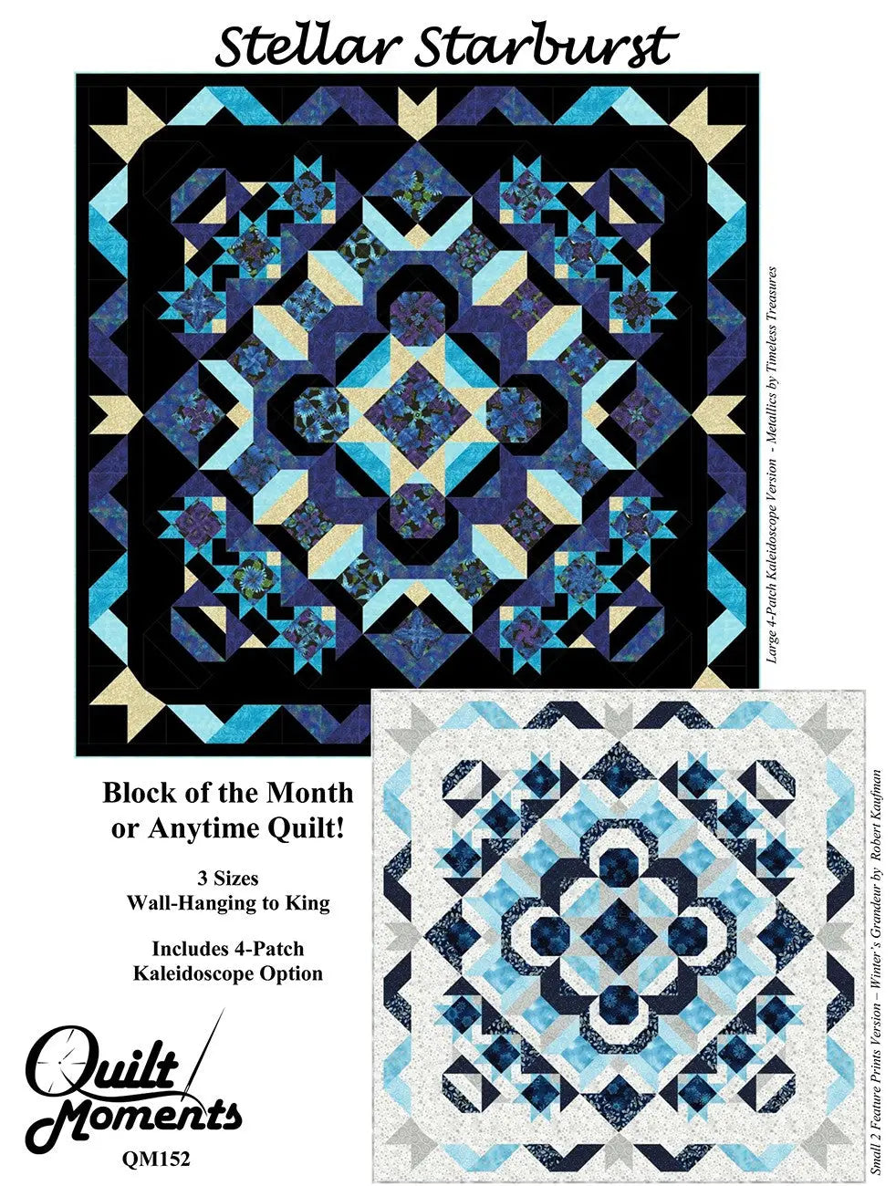 Striking 12 month Block of the Month or anytime quilt! Suitable for all skill levels since the pieced blocks are made from squares and rectangles; no y-seams or difficult piecing. See inside for detailed fabric requirements and hints for selecting fabrics. Make block centers with squares cut from one or two feature prints; or create easy 4-patch kaleidoscope centers with a medium or large scale print. In addition to the feature print(s), you will need a background fabric, plus 5 other fabrics. No specific required rulers, however, instructions include recommendations for some optional helpful tools. 3 Sizes: Small 53in x 53in, Medium 72in x 72in, and Large 106in x 106in Sample quilts on cover/back feature kaleidoscope versions with Timeless Treasures' metallic fabrics and 2 feature fabrics versions with Robert Kaufman's Winter's Grandeur collection, plus version using Banyan Batiks by Northcott.