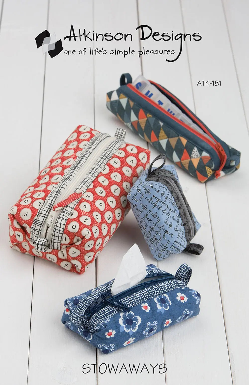 Stowaways: Take a look inside, there are no raw edges anywhere. A pair of fat quarters will make 2-3 of these classy little bags. Six sizes included in pattern.
