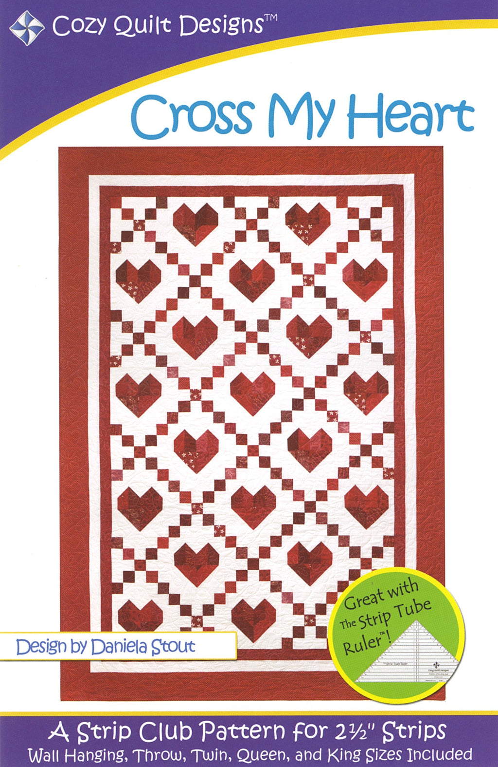 Cross My Heart - A Strip Club Pattern Designed for 2½" Strips Cross My Heart is a combination of the classic chain block and a charming heart block. You can make it with reds and whites like ours, OR how about shaking it up with a chocolate brown background? And you can make the heart a little easier with the Strip Tube Ruler™. The pattern includes instructions for: • Wall Hanging • Throw • Twin • Queen • King