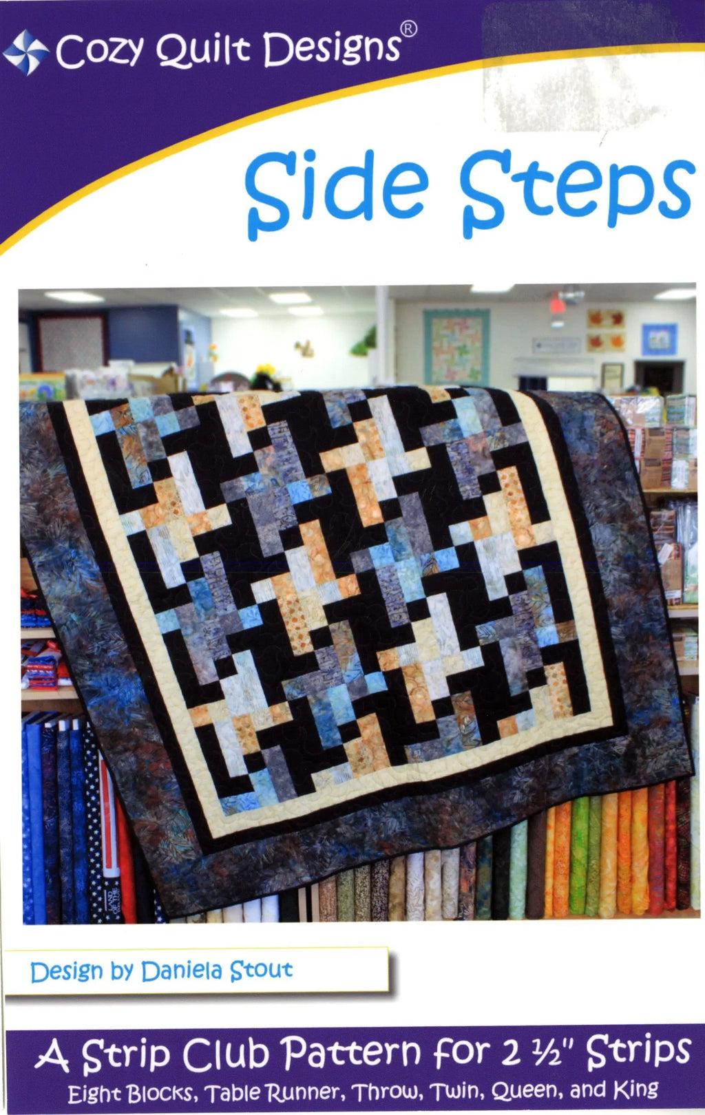 Side Steps - Written for 2 ½” strips, Side Steps is an instant classic, creating an almost hounds tooth design by adding background fabric to the strips. With just one simple block, the quilt comes together easily and beautifully. Not only does the pattern have a listing for multiple sizes, it also gives you the option to separate your fabrics into lights and darks or into two color families. As you can see by the quilt on the cover image, separating out into equal stacks of lights and darks will give you a subtle ribbon effect through the quilt. Or, you can go totally scrappy for an equally striking quilt. Directions are there for both!! The pattern includes instructions for: Table Runner 20in x 70in Throw 59in x 69in Twin 79in x 99in Queen 99in x 109in King 109in x 109in