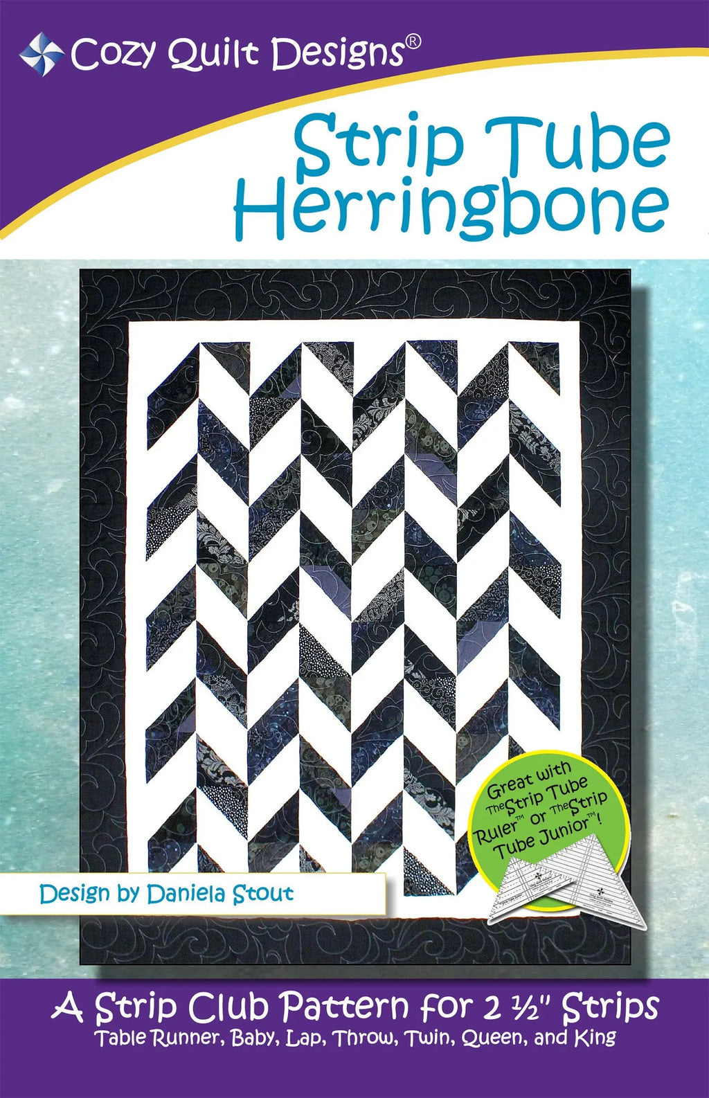 Strip Tube Herringbone - A Cozy Strip Club Pattern Designed for 2½" Strips Strip Tube Herringbone! In classic Cozy style, the pattern is a simple, one block pattern. Use our old friend The Strip Tube Ruler™ to make your blocks, and then bring the pattern to life by twisting and turning them. Here at Cozy we like to create patterns you can make your own. Strip Tube Herringbone is no exception! Its minimalistic design allows for versatility in your color choices, creating thousands of possible combinations and looks! The pattern includes instructions for: • Table Runner • Baby • Lap • Throw • Twin • Queen • King