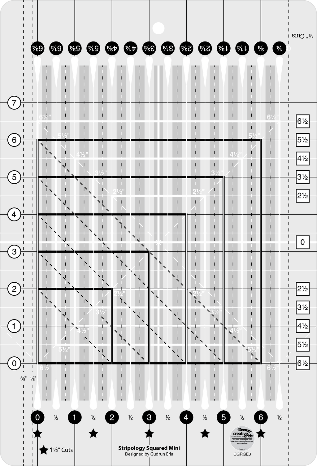 This is the tool that changes everything. Designed by Gudrun Erla, the Stripology Squared Mini Ruler makes cutting faster, easier, and more precise—so you can spend more time quilting, less time prepping. With the Stripology Ruler, you will replace 90% of your rulers and cut up to 75% faster.