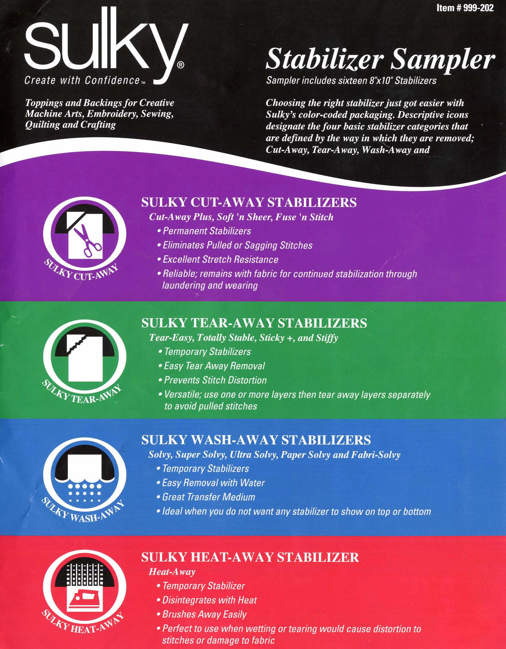 This Stabilizer Sampler Pack is a wonderful teaching tool and is also the perfect way to purchase all the Sulky Stabilizers very inexpensively. Then you can choose with confidence just those stabilizers that work best for you. Package contains (1) 8 X 10 sheet of all 19 styles of Sulky stabilizers.