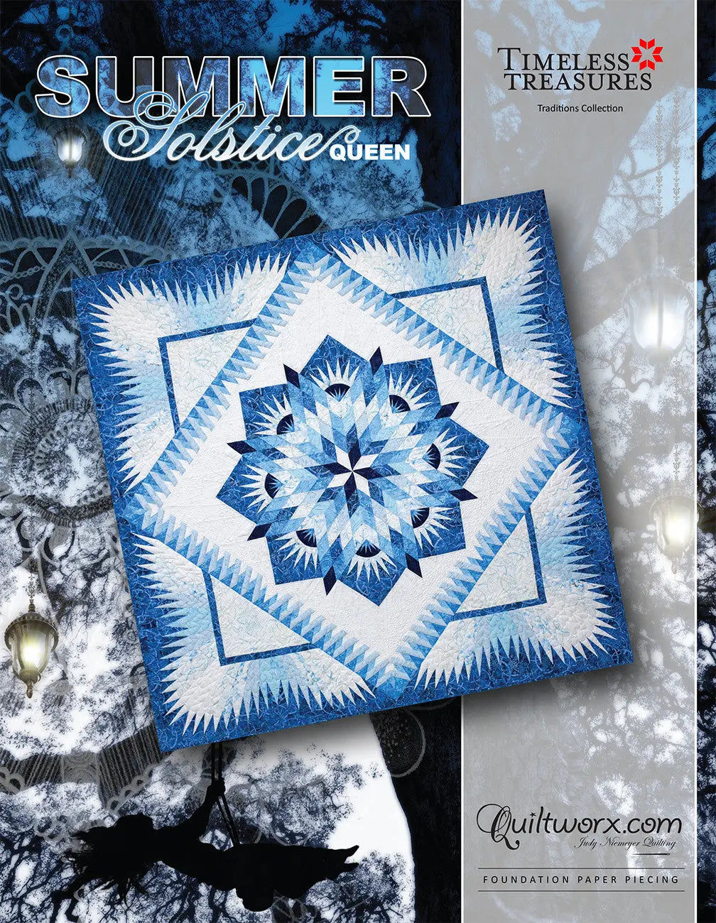 Summer Solstice Queen: The Summer Solstice Queen pattern is a long awaited publication from Quiltworx, expanding the Summer Solstice pattern, a customer favorite, to a Queen size layout. To accomplish this, a few changes had to be made to the pattern. In addition, some updated techniques were incorporated into this design to increase yardage efficiency, time efficiency, and organization. Through these updates, we have designed a great pattern, although not compatible with the original design. As a result, if you are hoping to use this queen pattern to expand the original quilt, we recommend just remaking the center and New York Beauty units using the new papers. During assembly, you will be very glad that you did!