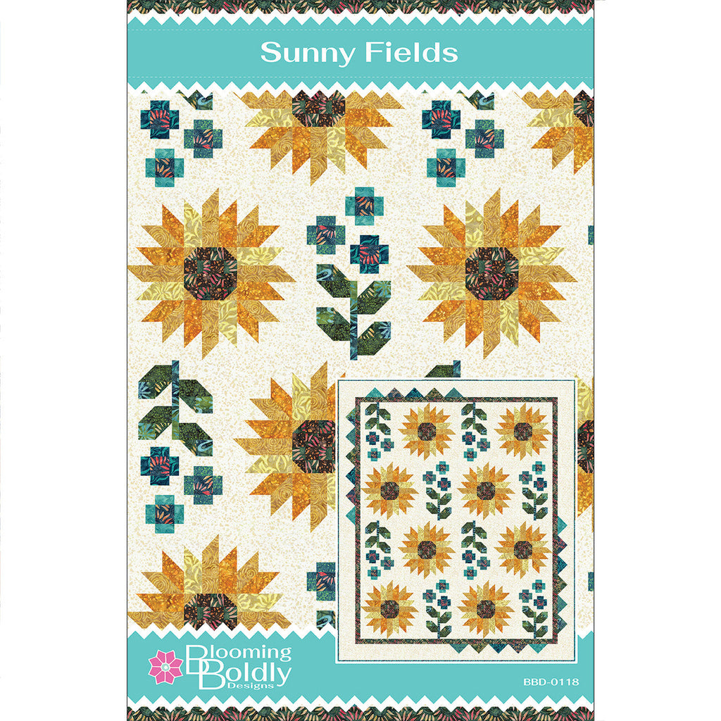 Sunny Fields by Leslie Ryan of Blooming Boldly Design features alternating sunflower blocks and flower cluster blocks. Bring the happiness and warmth of a field of sunflowers into your home with this beautiful quilt. Traditional piecing methods. Finished size is 71 1/2" x 85".