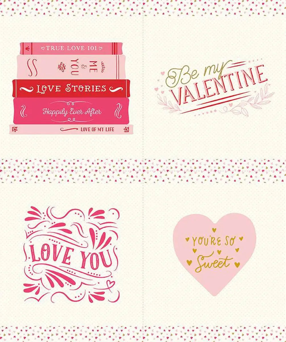 Item Description: Sweetheart by My Mind's Eye for Riley Blake Designs is great for quilting, apparel and home decor. This pillow panel features four Valentine-themed squares. Panel size is 36" x 43".