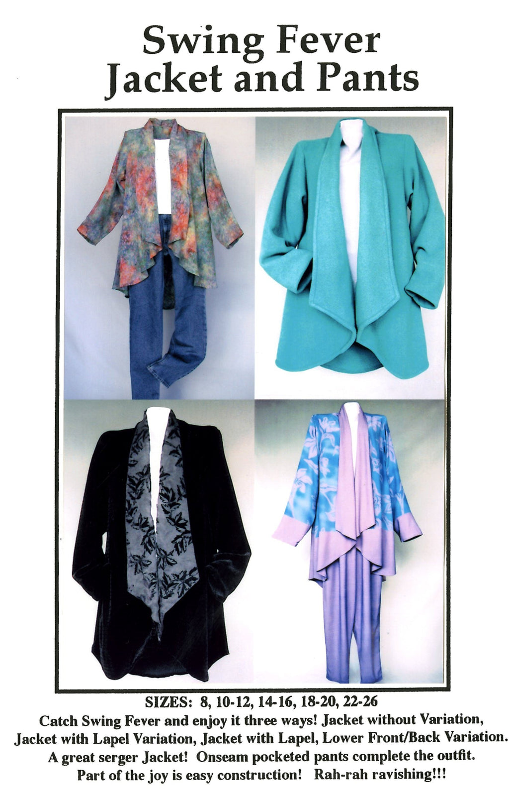Swing Fever Jacket & Pants: Catch Swing Fever and enjoy it three ways! Jacket without Variation, Jacket with Lapel Variation, Jacket with Lapel, Lower Front/Back Variation. A great serger Jacket! Onseam pocketed pants complete the outfit. Part of the joy is easy construction! Rah-rah ravishing!!! Sizes included: 8-26