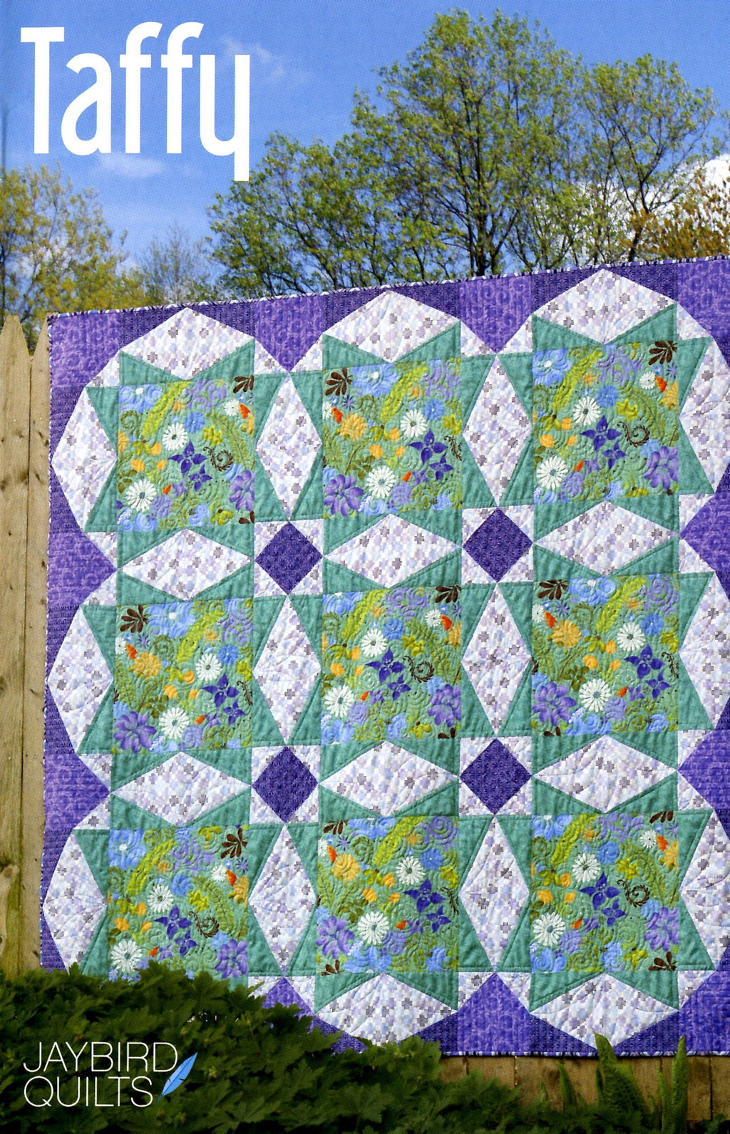 Discover the delightful Taffy quilt pattern, perfect for adding a touch of whimsy to your home or as a charming gift. This quilt features a vibrant array of floral designs set within star-shaped blocks, bordered by a striking purple frame that brings out the lush green and white accents. Ideal for quilters of all levels, this pattern uses the Creative Grids Lazy Angle Ruler CGR3754, ensuring precise cuts for the 6-1/2in x 10-1/2in blocks. The quilt's dimensions are a generous 60in x 60in, making it a standout piece in any room or event.