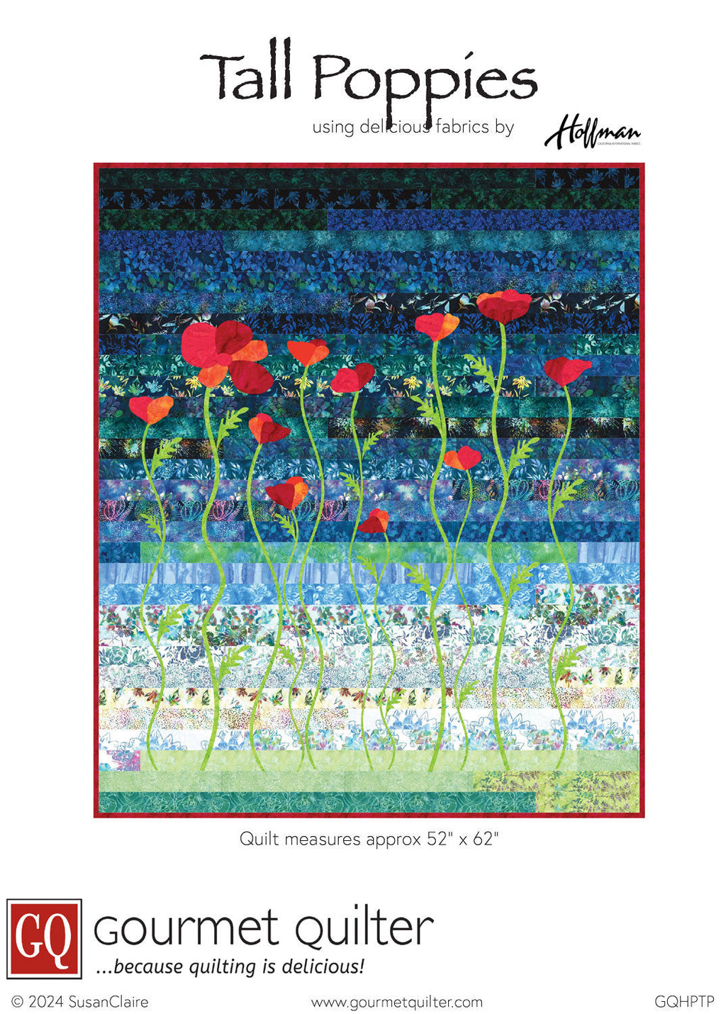 Tall Poppies, measuring 52" x 62", is a delightful quilt using a Hoffman Bali Pop for the background with the poppies appliqued (fused) on top.