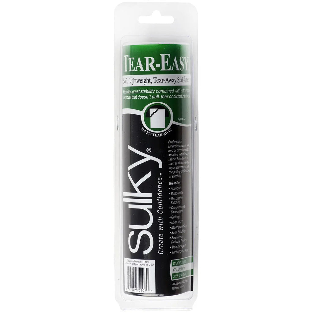 White - 8in x 12yd. Sulky Tear-Easy stabilizer is temporary, lightweight and soft. It provides great stability combined with effortless removal that doesn't pull, tear or distort stitches. Professional embroiderers use 1, 2 or 3 layers to stabilize virtually any fabric and quilters use it for foundation piecing and as a removable design template. Just remember to tear-away one layer at a time. Tear-Easy is perfect for any project where wetting or heating is not the desired method of removal. All Sulky stabilizers are acid and lead free!
