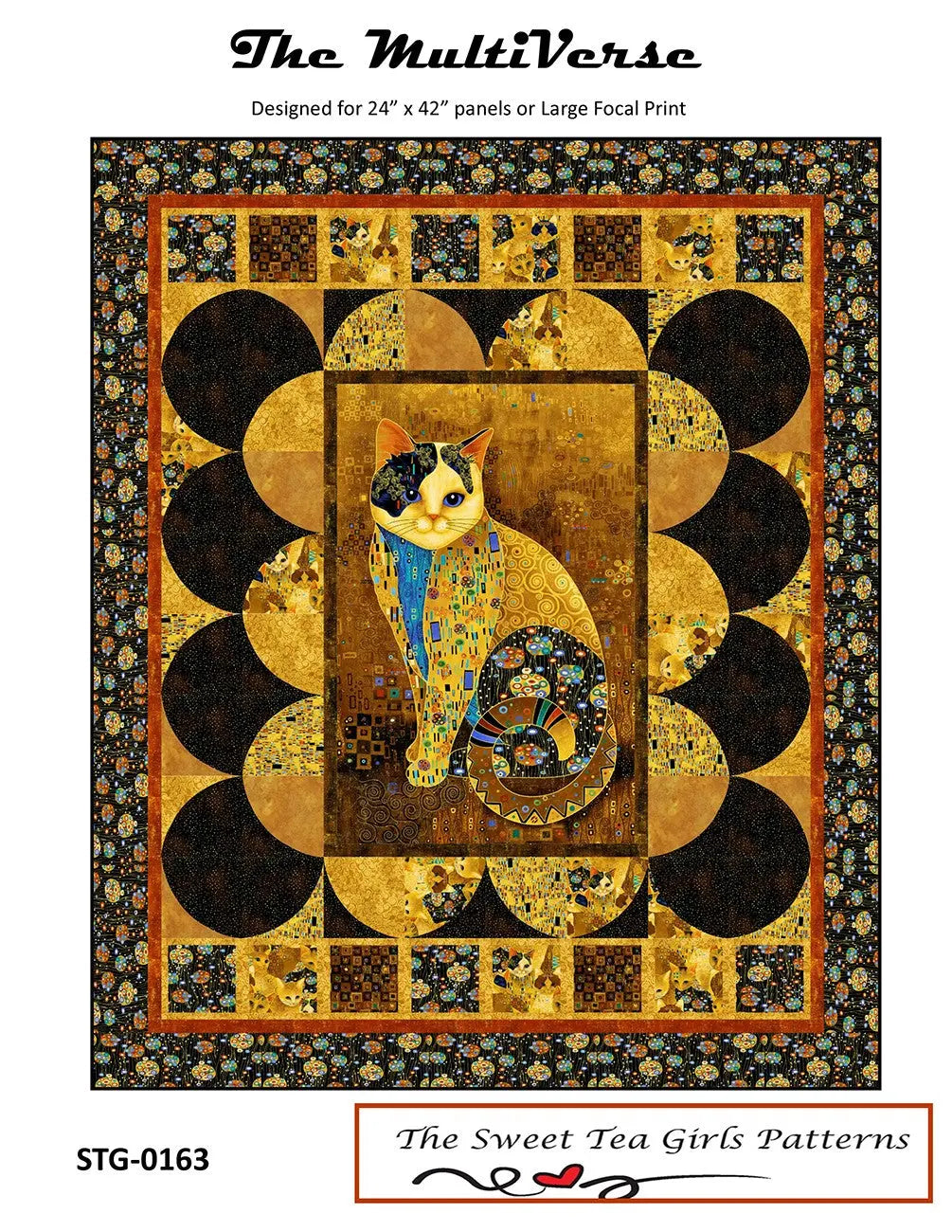 The MultiVerse is designed to highlight 24" x 42" panels using forgiving, easy to piece circles and basic piecing. The center panel is trimmed to a 34" length so it works with a wide range of designs. From Steampunk to Graphics Arts, the design takes the panel into another universe. The quilt throw measures 58" x 70".
