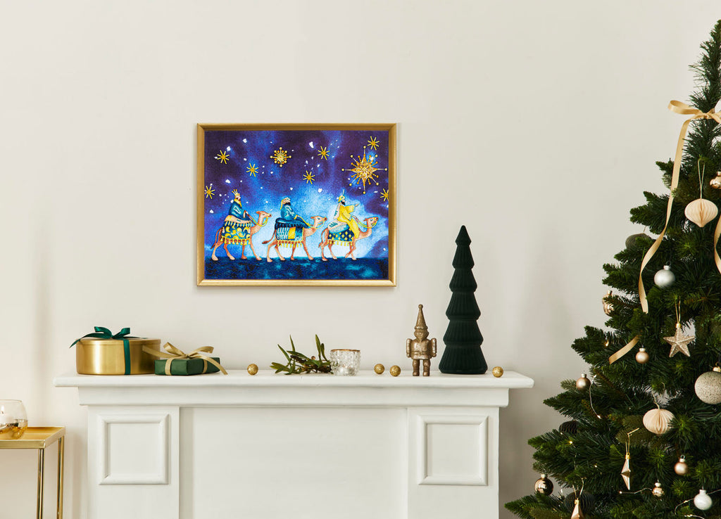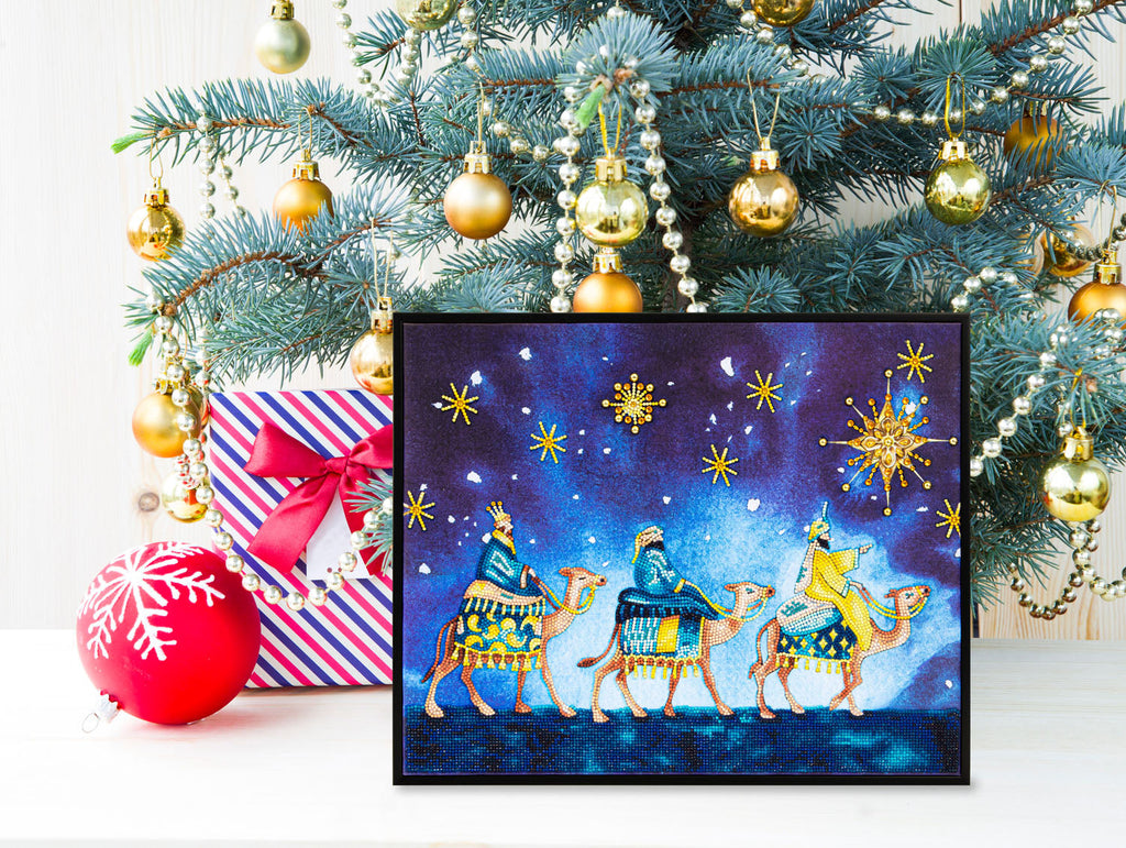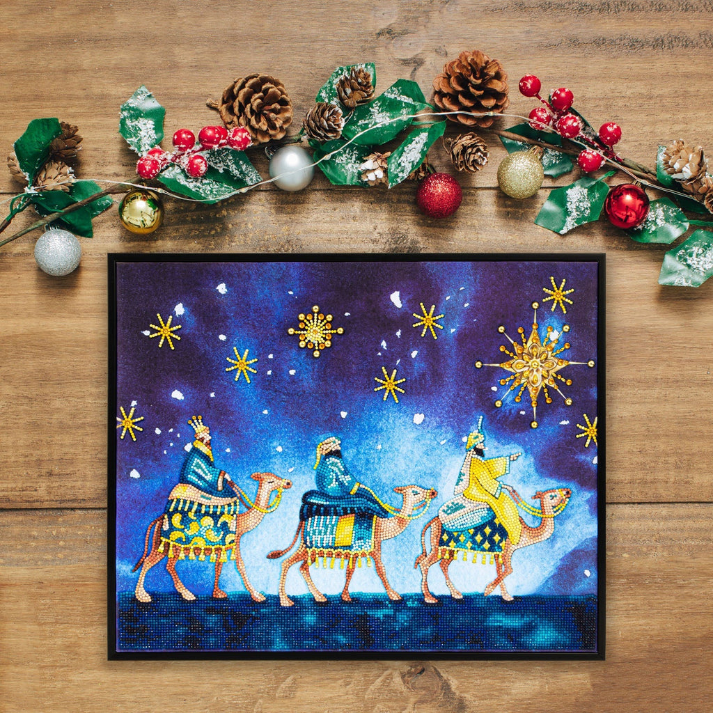 Bring the majesty of the season to life with Three Wise Kings. This elegant diamond painting features the three wise men traveling on camelback beneath a brilliant blue sky, guided by the star of Bethlehem. With partial coverage and shimmering round DOTZ®, it beautifully captures the reverence and wonder of the Nativity story—perfect for adding a touch of timeless grace to your holiday décor.