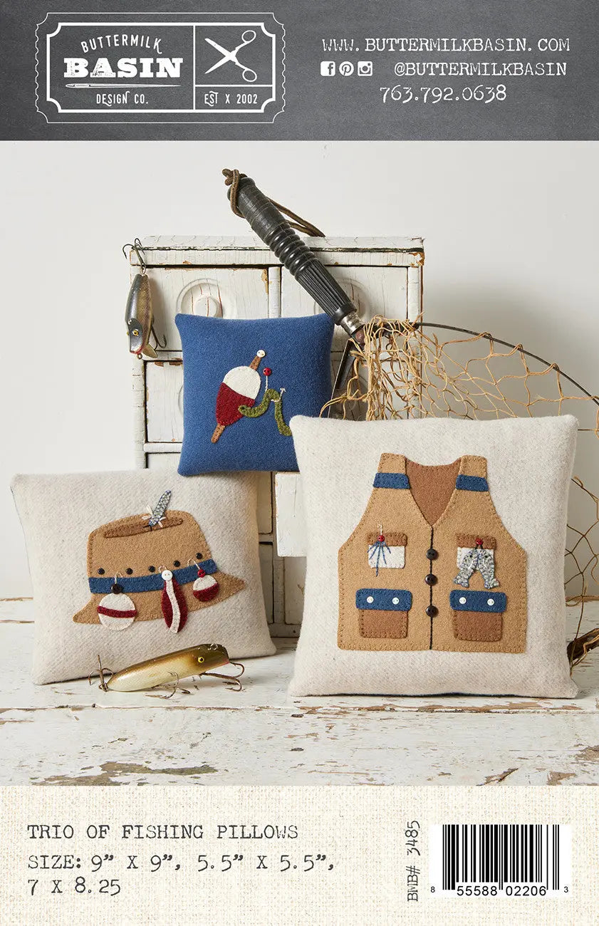 Trio of Fishing Pillows: Sizes: 9 X 9, 5.5 X 5.5, 7 X 8.25 inch. Perfect to decorate the lake home, cabine or man cave! Our trio of fishing pillows also coordinate with any outdoorsy theme!