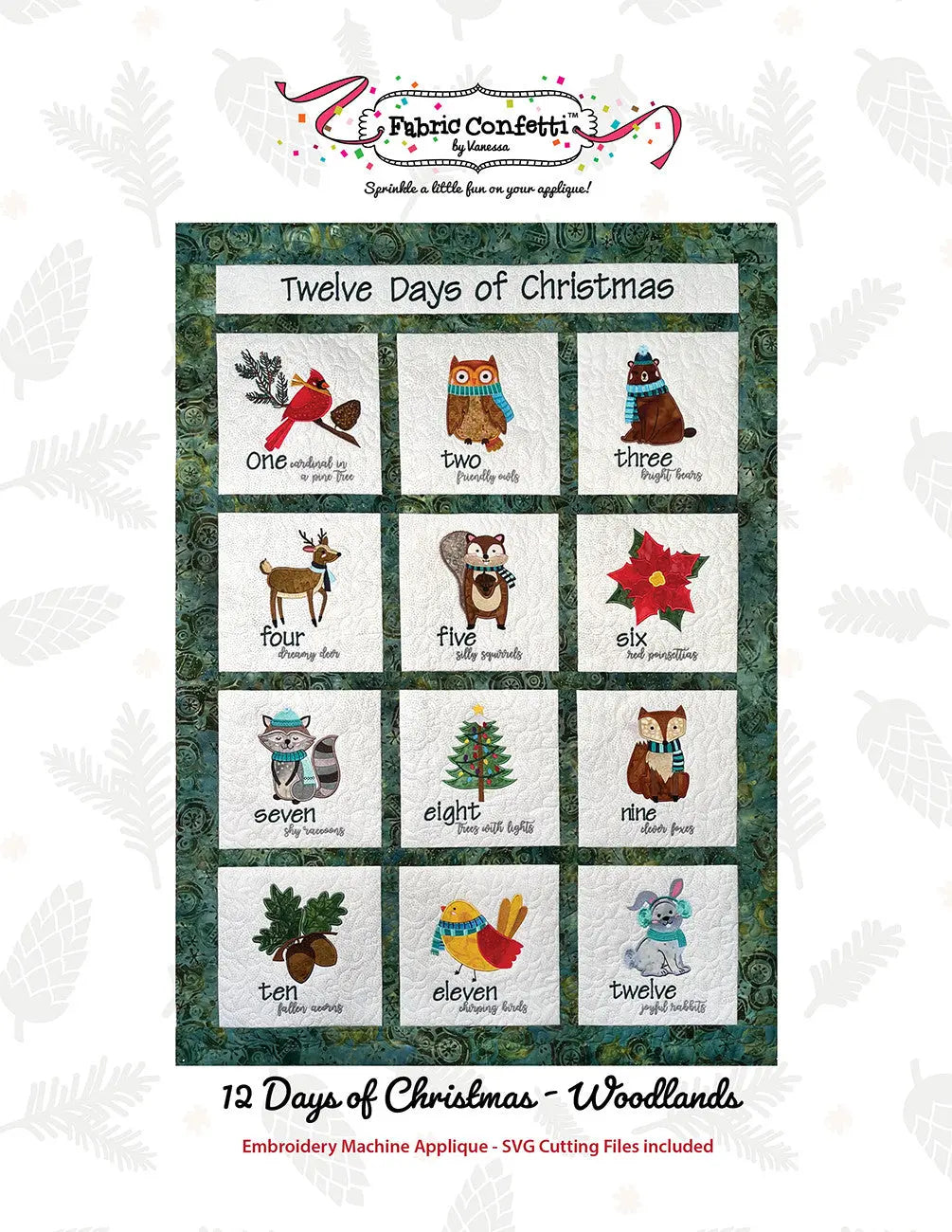 This Twelve Days of Christmas - Woodlands embroidery pattern is a new take on a traditional Christmas theme. These designs can be quilted “in the hoop” or may be completed without background quilting in a smaller hoop size. This pattern contains the following: A collection of machine embroidery designs in the following formats: .ART, .DST, .EMB, .EXP, .HUS, .JEF, .PES, and .VP3. For the quilted designs, a hoop with an embroidery field APPROX 240mm x 240mm (9.4” x 9.4”) or similar is REQUIRED. Non quilted designs require a hoop with and embroidery field APPROX 160mm x 260mm (6.29” x 10.2”). BONUS: Designs WITHOUT wording (ie: only the squirrel, not “Day5” or the words “silly squirrels”) are also included. These designs can be used year-round to decorate totes, napkins, aprons etc. A hoop that is at LEAST 160mm x 260mm (6.25 x 10.25) is required. Mirror and non-mirror templates for cutting out shapes. Cutting instructions and SVG cutting files that can be used with your preferred electronic cutting machine.