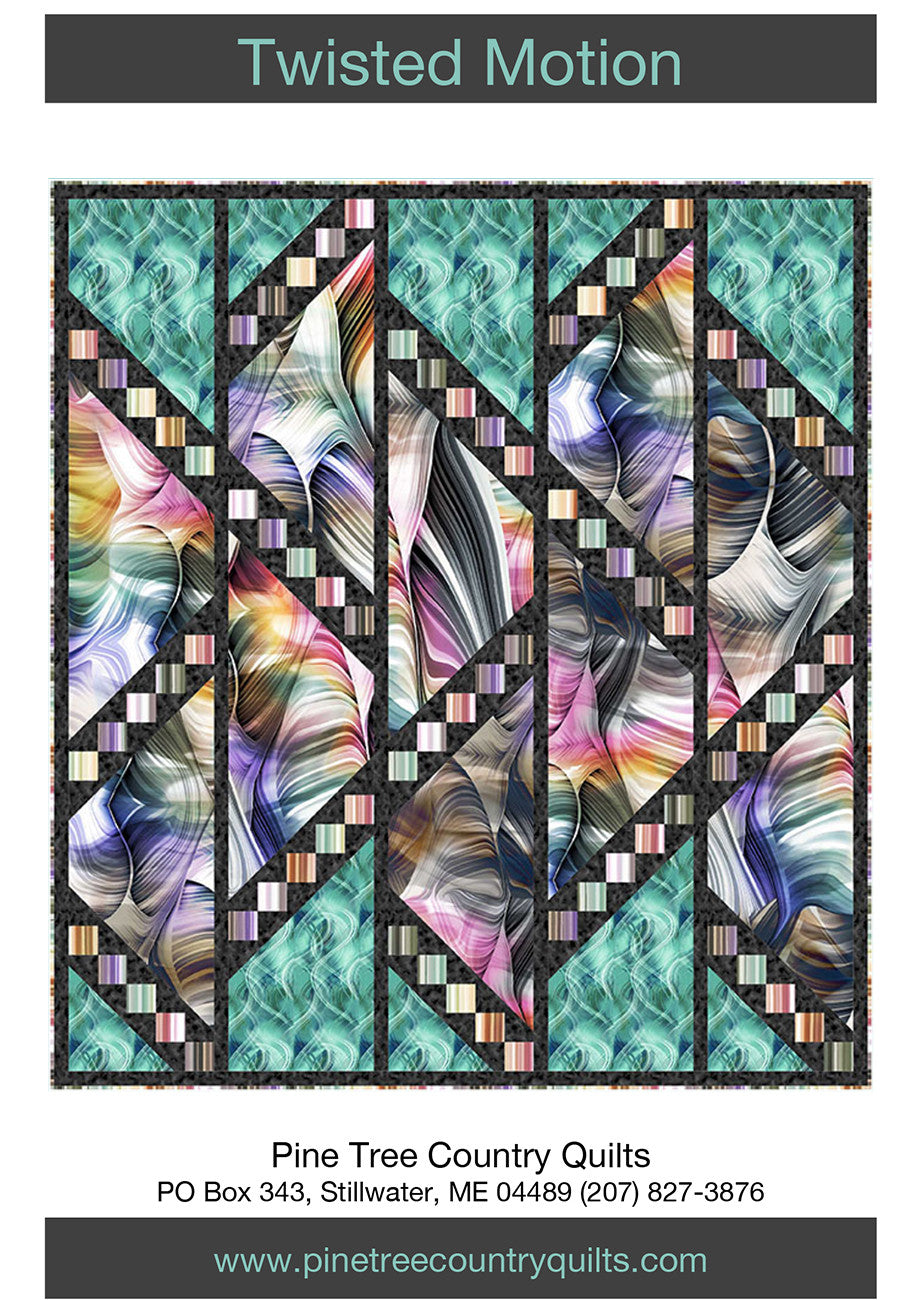 56" x 62" throw quilt. Large pieces cut from the panels and print. Angled strips made with stripe squares and oversize triangles. Spray starch or pray stabilizer very useful to prevent stretching of the angled pieces. Fabrics shown from the Synergy collection by QT Fabrics. Skill level: intermediate.