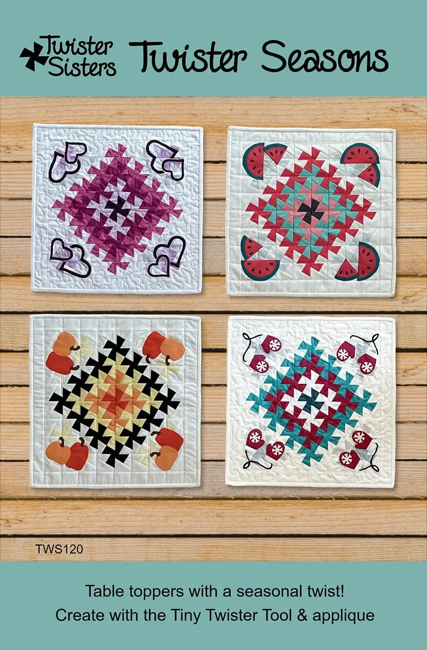 Combine applique and a twister pinwheel background to make table toppers for Fall, Winter, Spring and Summer. Make for Halloween, Christmas, Valentine’s Day or Independence Day and enjoy for the entire season. Uses the Tiny Twister tool. Applique Pumpkins, Mittens, Hearts, or Watermelons onto a pinwheel background in coordinating seasonal colors. Finished size is 16in x 16in.
