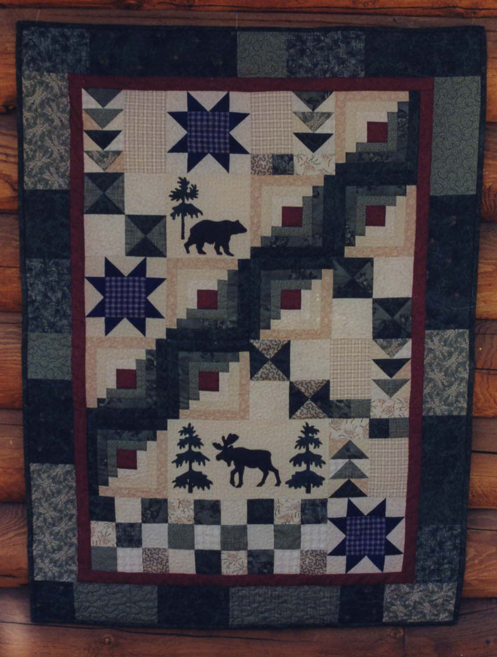 This pattern was designed as a beginning or intermediate quilt making class. It features Nine Patch blocks, Flying Geese, Saw Tooth Star, Hour Glass blocks made from quarter square triangles, Paper Pieced Log Cabin blocks, fusible applique, a plain inner border, and a pieced outer border. Finishing techniques are covered as well. Finished size 33in x 47in