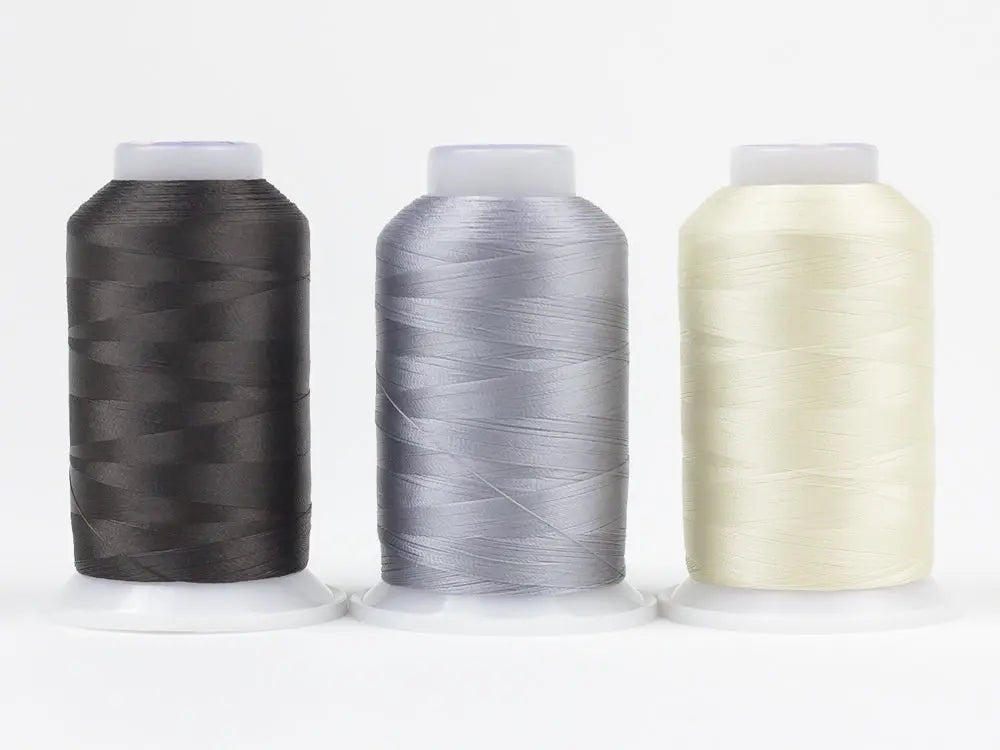 Each pack includes three 2000m (2187yd) spools in the following colours: Charcoal (DB168), Dove Grey (DB113), and Antique White (DB112).