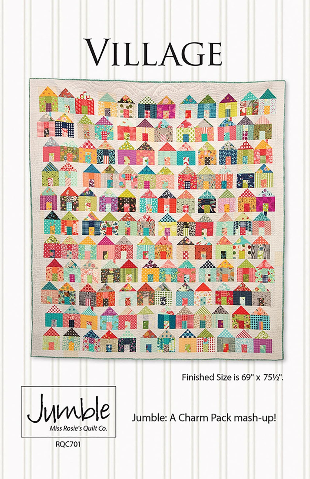 Village: Discover the charm of the 'Village' quilt, a delightful patchwork of colorful houses that brings a whimsical village to life on your bed. This quilt, measuring 69 inches by 75.5 inches, is perfect for adding a playful and cozy touch to any bedroom. The intricate design features a multitude of small houses, each with unique details like windows, doors, and chimneys, creating a vibrant and engaging visual story. The quilt is crafted using 50 small charm squares, ensuring each house is distinct and adding to the overall charm of this piece.