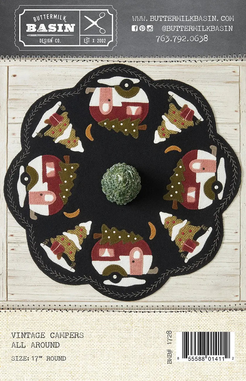 These vintage campers are all decked out for the holidays! The wool applique mat is 17in round.