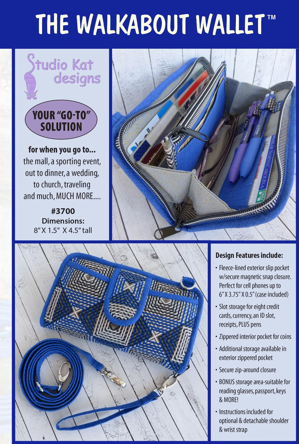 A fleece-lined exterior slip pocket, suitable for a large smart phone,interior slot-pocket storage for 8 credit/debit/loyalty cards, an ID card, currency, receipts, checkbook and pens, zippered coin storage,a secure zip-around closure, AND instructions are included for an optional shoulder/cross-body strap and a wristlet, enabling this wallet to be carried handsfree.