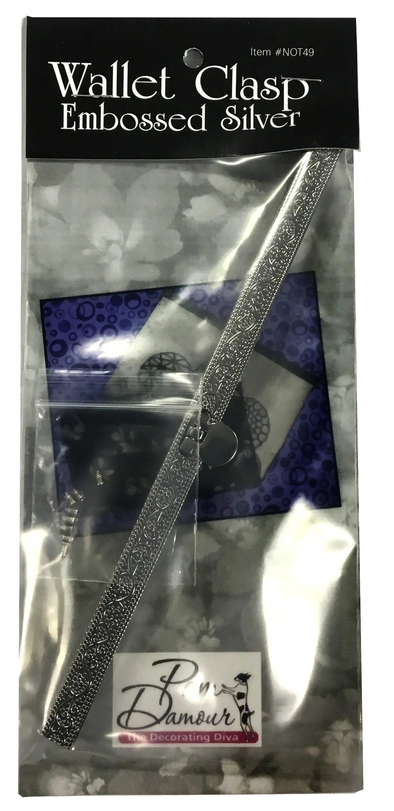 Wallet Clasp Embossed Silver 7-1/2in: This 7-1/2in wallet clasp is beautifully embossed.* Color: Gray* Made of: Metal* Use: Bag Hardware* Size: 7-1/2in long* Included: One Wallet Clasp