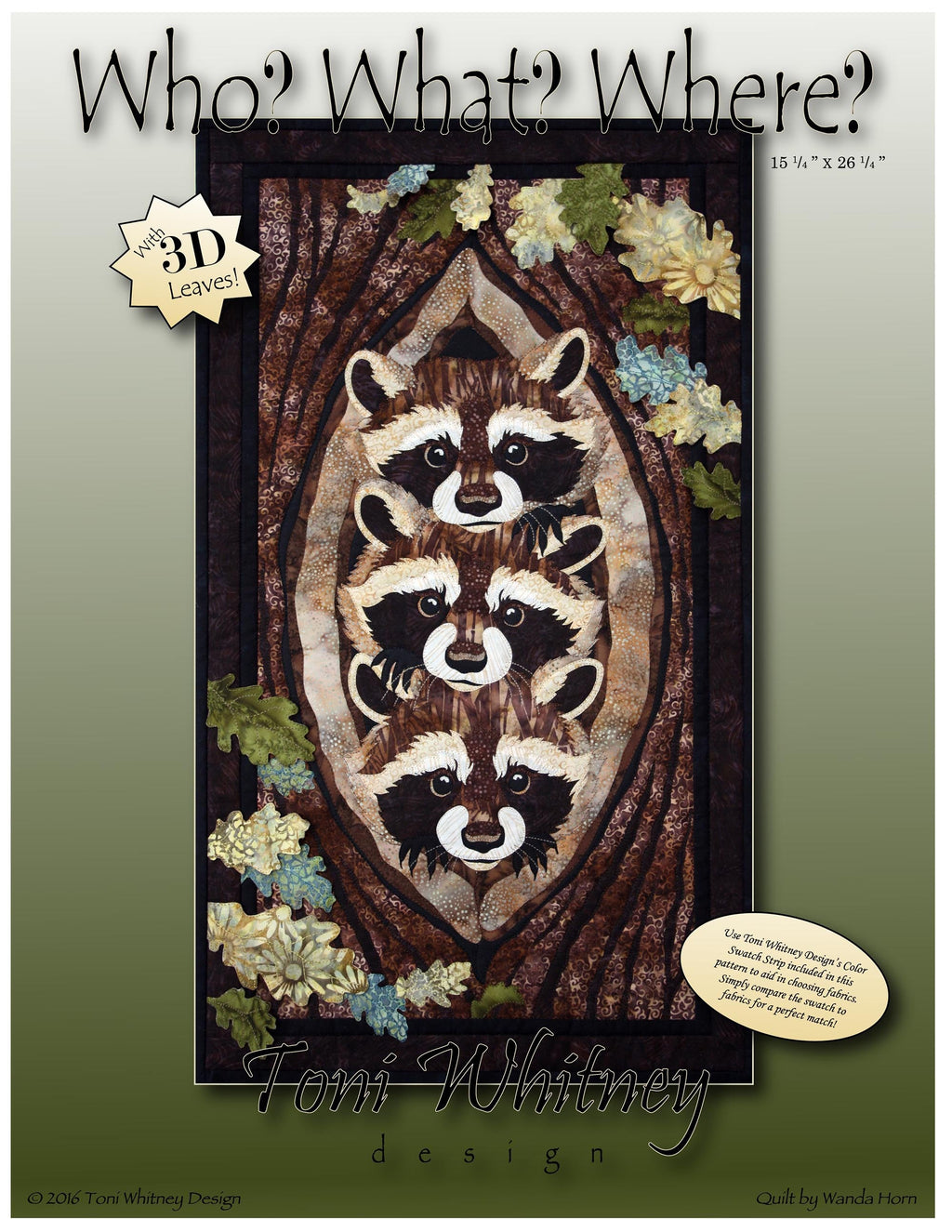 Discover the enchanting world of the 'Who? What? Where?' Fusible Applique Art Quilt, a delightful project that brings a touch of whimsy to any space. This quilt features three adorable raccoon faces peeking out from a tree trunk, surrounded by vibrant 3D leaves and delicate flowers, creating a captivating 3D effect. With a finished size of 15-1/4 inches by 26-1/4 inches, this quilt is perfect for adding a playful yet sophisticated touch to your home decor or as a unique gift.